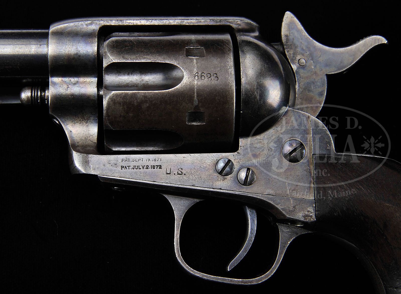 Please Note: Estimate should be $25,000-32,500. SCARCE CASEY INSPECTED COLT CAVALRY SINGLE ACTION ARMY REVOLVER. SN 16623. Cal. 45 Colt. Blue & color case hardened with 7-1/2″ bbl, full front sight and 1-line script letter address with serifs. Left side of the frame has 2-line patent dates and “U.S.”. Mounted with a 1-pc walnut grip which has last four digits of matching SN in back strap channel. Left side of the grip has partially legible “APC” (A.P. Casey) inspector cartouche. Right side is correctly without cartouche. Ejector housing is first type with bull’s eye ejector rod head and base pin is orig type with dimpled ends. Bottom right edge of the grip, bottom of the bbl, trigger guard, back strap & cyl are marked with a small “C” (also for A.P. Casey). The “C”s on bottom of bbl & cyl are of a different size font which, according to A Study of the Colt Single Action Army Revolver, Graham, Kopec & Moore, this disparity in letter size is correct in that it is believed Mr. Casey simply used two different sized stamps. Butt strap is hand-scratched with the initials “JHN”. This revolver was produced in 1875 at the height of the Indian Wars and almost certainly would have been issued to a front line cavalry unit and would have seen service on the American frontier. That it escaped the recalls of the 1890s and early 1900s attests to the theory that it was either lost in battle, stolen or assigned to a militia unit. It is known that there are several revolvers in this series which were assigned to the 7th Cavalry as replacement revolvers after the Battle of the Little Big Horn. CONDITION: Very fine. Bbl retains about 75% strong orig blue with holster wear on the left side and thinning over the top; frame retains bright case colors in the front gullets and left side, more faded on the right side and top strap; recoil shields also retain bright case colors, turned silver on the loading gate; hammer retains strong, bright case colors, turned silver on top edge; trigger guard & back strap retain blue in sheltered areas, strong on the trigger plate, faded to a blue/gray patina on the front & back straps and butt strap; cyl retains strong blue in the flutes, flaked to a medium patina on the outer diameter; chambers of the cyl and bore retain strong orig blue. Grip is sound showing moderate edge wear and retains a hand worn patina. Mechanics are fine, bright shiny bore, shows very little use. 4-48241 JR367 (25,000-32,500)
