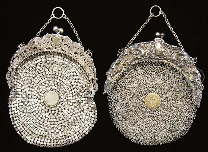 TWO STERLING SILVER MESH PURSES. Lot consists of two very fine sterling silver purses each with a rounded body and center disk with engraved initials. One purse has a lovely open work design frame while the other frame is high relief art nouveau design of lilies. Each purse is stamped “sterling” on the inside. Each purse weighs over 6 oz. SIZE: Each purse is approximately 6″ in diameter not including handle. CONDITION: Both are very good to excellent. 5-64364 (300-500)