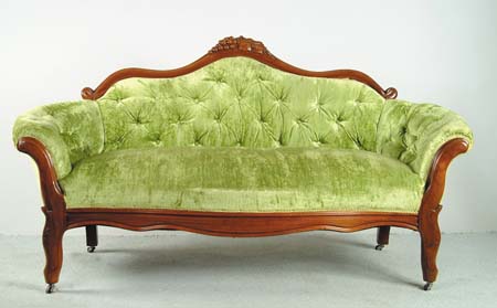 GRAPE CARVED WALNUT VICTORIAN SOFA. Lime green tufted upholstery, serpentine front with nice carved crest. SIZE: 34-1/2” h x 64” x widest x 24” d. CONDITION: Very good. 9-96236 (250-350)