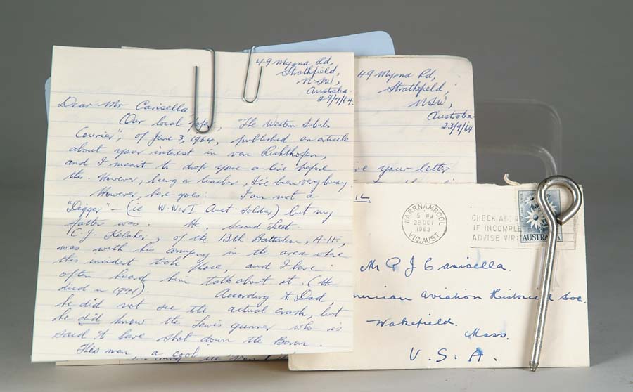 LOCKING PIN, ATTRIBUTED TO BE FROM VON RICHTHOFEN’S PARACHUTE. Locking pin of brightly polished metal, and silver in color, is purported to have come from the quick release buckle of von Richthofen’s parachute harness. Photographs show that parachutes were in use by JG 1 at the time of von Richthofen’s death. In letters to Carisella, Australian witness F. Wormald of No. 3 Sqdn. indicates that a parachute was in von Richthofen’s tri-plane at the crash scene. Carisella received the locking pin from C. Kelaher’s son. An Australian gunner had given Kelaher the pin as a souvenir. A photograph of the locking pin appears on page 237 of Who Killed The Red Baron? CONDITION: As found. SIZE: 3-1/8” long x 3/16” in diameter. From the Collection of the late P. J. Carisella. 4-53508 CW9 (2,000-2,500)