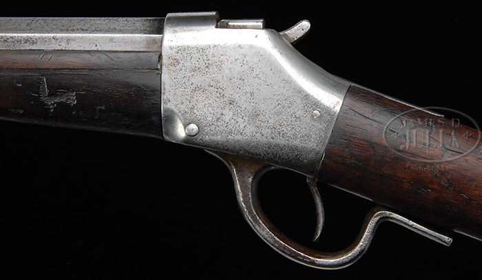 RARE BROWNING MODEL 1878 SINGLE SHOT RIFLE. SN 228. Cal. 40-70 Sharps straight. Rare Browning rifle with very rare 34″ oct bbl, half nickel front sight and what is probably a Browning-made Kentucky rifle style sporting rear sight with elevator. Top flat of bbl, above rear sight, is marked “J.M. BROWNING OGDEN, U.T. PAT. OCT. 7, 79”. Receiver is 2nd type, thinner with short tangs and a nearly flat top breech block. Lever is a short Borchardt style. Mounted with uncheckered, straight grain American walnut with long, rounded forearm & straight stock with crescent buttplate. Forearm has a long spliced repair in the top left edge and the right 1/3 is another old spliced repair. Mr. Kontes states that he purchased this rifle in Butte, Montana from “Phil Judd’s wife”. PROVENANCE: John C. Kontes Collection. CONDITION: Good. No orig finish remains with the metal being a cleaned silver patina with fine pin prick rust pitting over about half the bbl & left side of receiver. Stock has several grain checks with the aforementioned repaired forearm and shows heavy wear with numerous nicks, dings & scratches and retains a dark hand worn patina. Hammer will sometimes not catch in the full cock notch on closing, otherwise mechanics are fine, strong bore with moderate to heavy pitting. 4-46628 JR343 (18,000-28,000)