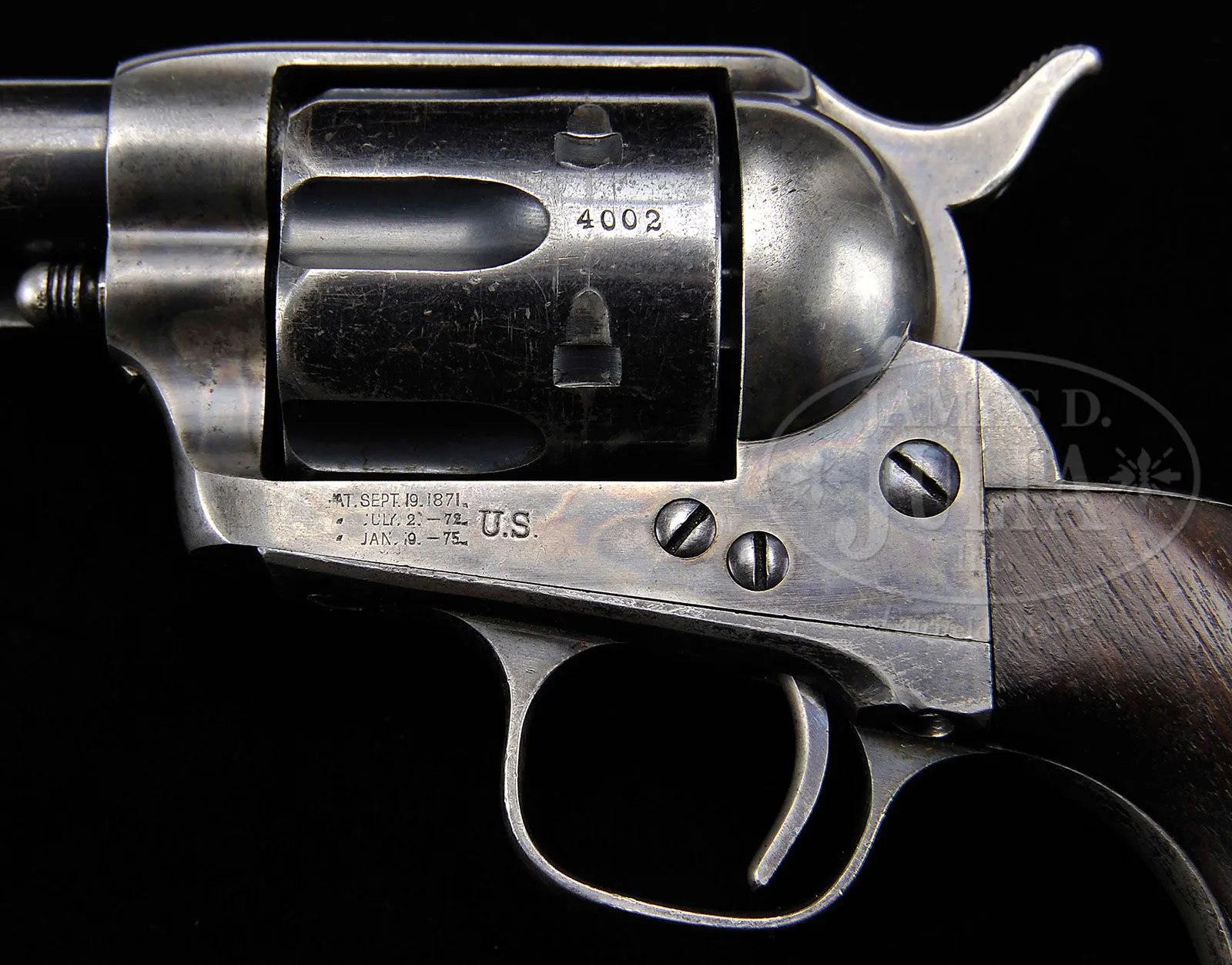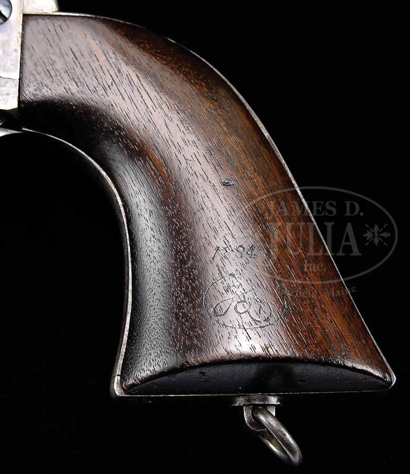 Please Note: Estimate should be $10,000-12,000 COLT CAVALRY SINGLE ACTION ARMY REVOLVER. SN 114002. Cal. 45 Colt. Blue and color case hardened with 7-1/2″ bbl, slightly altered front sight and 1-line block letter address. Left side of frame has 3-line patent dates and “U.S.”. Mounted with an orig 1-pc walnut grip that has the 4 numbers of a SN which appear to be “6441” in the backstrap channel. Left side of grip has the “FH” (Capt. Frank Heath) inspector cartouche under the date 1884 and the right side has the outline of the “DFC” (David F. Clark) sub-inspector cartouche. Left bottom edge of grip, bottom of frame, bbl and cyl also have the “DFC” inspector initials. Trigger guard and buttstrap are stamped with the mystery “G” inspector initial, believed to be a Colt inspector. Ejector housing is 2nd type with bullseye ejector rod head and the buttstrap has a Lanyard swivel. This revolver was from the 9th contract signed August 11, 1884 and was completed on Jan 31, 1885. This revolver was produced in 1884 at the height of the Indian Wars in the American West. It is unusual to find such a revolver with strong orig finish and in orig configuration. It is also noteworthy that it does remain in its orig configuration, escaping the recalls and conversions of the 1890’s and early 1900’s were hundreds of cavalry revolvers had their bbls reduced to 5-1/2″, artillery configuration. Accompanied by a Colt factory letter which identifies this revolver in caliber 45, bbl length & type of stocks not listed, blue finish and delivered to the U.S. Government inspector at the Colt plant Jan. 7, 1885 in a 200-gun shipment. CONDITION: About fine, all matching except grip, as noted. Bbl retains about 80% strong orig blue, showing wear on left side and right side of muzzle; front sight has been slightly filed; both sides of front sight and both sides of the ejector housing stud show strong feathers; frame retains bright case colors on the sides, fading towards the front, with bright colors in the front gullets fading towards the top; left recoil shield and loading gate are mostly faded to silver, as is the top strap; hammer retains bright case colors, showing wear on the left side, faded to silver on top edge; trigger guard retains traces of orig blue having flaked, not worn, to a blue gray patina; backstrap retains strong case colors on the top with center and backstrap a blue gray patina; cyl retains 75-80% orig blue, lightly flaked and thinning on outer diameter with strong blue in flutes; base pin is a replacement without dimpled ends; ejector housing retains strong blue in gullets with the outer radius a blue gray patina; grip is sound, showing moderate wear and a hand worn patina; hammer is not solid in safety or half cock notches, otherwise mechanics are fine; bright shiny bore with scattered very light pitting; screws are fine and retain strong orig fire blue. 4-47541 JR167 (10,000-12,000)