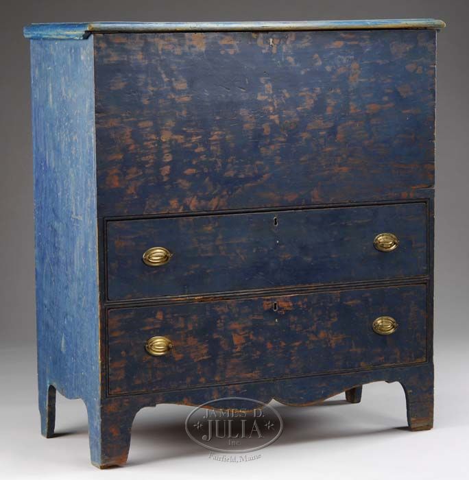FINE EARLY AMERICAN PINE TWO DRAWER BLANKET CHEST IN BLUE PAINT OVER ORIGINAL GREEN. Hinged rectangular top with molded edge above conforming case with well over two long drawers raised on French feet with shaped apron. SIZE: 43” h x 39-1/2” w x 18” d. CONDITION: Surface skinned with old hardware and original holes. Minor repairs to feet, repairs to lid at hinges. 9-74202 SM (800-1,200)