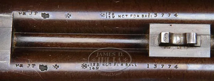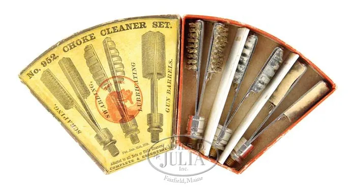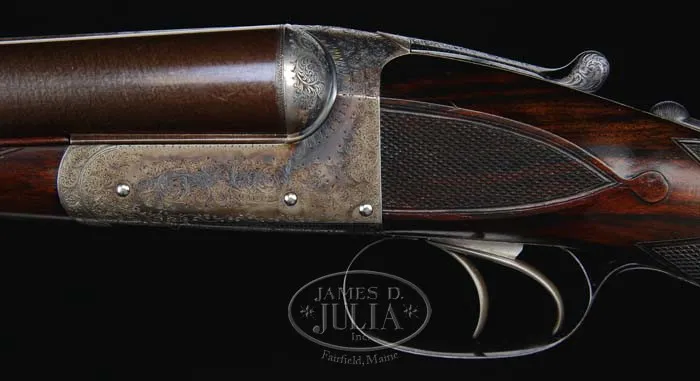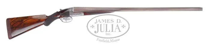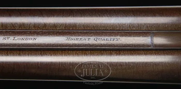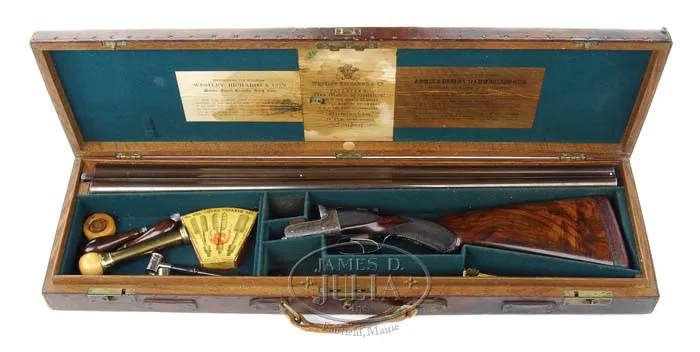 WESTLEY RICHARDS HIGHEST QUALITY BOX LOCK WITH ORIGINAL CASE AND ACCESSORIES. SN 13774. Cal. 12ga. 2-1/2″ Chambers. Double triggers. Automatic safety. 30″ Dove-tailed Damascus bbls are marked “Westley Richards. 170. New Bond St. London.” “Highest Quality” on the plain concave rib w/ typical Westley Richards dolls head extension. Bottoms of the bbls are marked w/ initials “WR” “J.P” and have Birmingham provisional and definitive black powder proofs: “12B” “13M” “Not for Ball” on the right bbl. The left is marked “12B” and “14M”. Both bbls have SN “13774” (1882) stamped. Case hardened action is marked “Anson & Deeley’s Patent” and “6165” on the water table and is engraved w/ well executed English scroll w/ “Westley Richards” in a riband on both sides of the action. The area in front of the top lever is engraved “Westley Richards” and “Patent” is engraved on the top lever. “Safe” is inlaid in gold in front of the safety button. Floor plate is engraved w/ scroll. Trigger guard has a dog chasing a pair of ducks and SN in an oval surrounded by scroll on the grip. The slightly figured and beautifully streaked English walnut Prince of Wales grip buttstock measures 14-3/8″ over leather covered pad. It features a vacant silver circle on the end of the grip, checkered side panels w/ drop points, and 18 LPI checkering w/ mullered borders. The splinter forend has a Deeley and Edge patent release, a horn tip, and checkering to match buttstock. Bore diameter: left -.739, right -.740. Bore restrictions: left -.034, right -.011. Wall thickness: left -.030, right -.035. Drop at heel: 2-3/4″, drop at comb: 1-7/8″. Weight:7 lbs 3oz. Original oak and leather case has dark green baize interior w/ Westley Richards & Co label, instructions for using the Anson and Deeley hammerless gun, and instructions for cleaning. SN 13774 is on a paper dot glued to lid. Accessories include 2 coco bolo handled turn screws, James Dixon ebony handled powder and shot measures, brass and boxwood wad rammer and base, 2-pc ebony cleaning rod, and a bone handled cleaning brush, as well as a wonderful Bridgeport Gun Implement Co number 952 choke cleaner set in its orig keystone shaped box. CONDITION: Excellent. Bbls retain 98%+ of their orig Damascus finish. Bores are bright and shiny, w/very slight pin prick pitting toward the muzzle of the left bbl. The action retains 95%+ of its orig case color, silvering on the edges of the fences. Floor plate, trigger guard and top lever retain virtually all their orig charcoal blue. The stocks retain 98% orig oil finish. Leather covered pad is a new replacement. Case leather is dark w/ numerous scuffs and scratches. One side of the handle is detached. Interior partitions are tight. Cloth is clean. Labels have some rubs and oil stains. Accessories are near new. A truly spectacular example of a gun from this period! 4-35538 MGM41 (7,000-10,000)