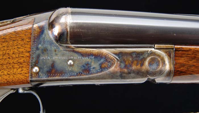 *SAVAGE FOX STERLINGWORTH DOUBLE BARREL SHOTGUN WITH ORIGINAL BOX. Cal. 20 ga. SN 264619. Beautiful early Fox with 28” Sterlingworth Fluid Compressed Steel bbls choked FULL/MOD with tapered, concave, matted rib, sgl bead, crossbolt rib extension, extractor & dbl triggers. Mounted with checkered, straight grain, American walnut with square splinter forearm & pistol grip stock, 14” over a serrated hard rubber buttplate. Receiver has light border decorations and “FOX STERLINGWORTH” on each side. Accompanied by its orig cardboard shipping box with green, black & white label numbered to this shotgun with the pencil price of $35.00. Box contains orig dividers. Also accompanying is the orig green, black & white hang tag fully identifying this shotgun, along with “THE FOX STERLINGWORTH” booklet. Additionally accompanied by an orig 1935 Fox Savage catalogue that lists all of the various grades of Fox shotguns ranging in price from $39.50 to $500.00. Bore diameter: left – .619, right – .619. Bore restrictions: left – .028, right – .018. Wall thickness: left – .022, right – .020. Drop at heel: 2-5/8”, drop at comb: 1-1/2”. Weight: 5 lbs. 14.72 oz. CONDITION: Extremely fine. Bbls retain 96-97% strong, orig blue with some slight thinning over chamber areas. Receiver retains virtually all of its brilliant, orig case colors. Wood is sound with small spot of touch-up on left side flat, otherwise retains virtually all of its orig factory varnish. Mechanics are crisp, brilliant shiny bores. This is as fine a Fox shotgun of its type one is likely to encounter. The box shows its 70 years of age being a dark, smoked color, but the label is completely intact and legible. Corners show wear with a couple of breaks and one repair. 4-31079 JR563 (5,000-8,000)