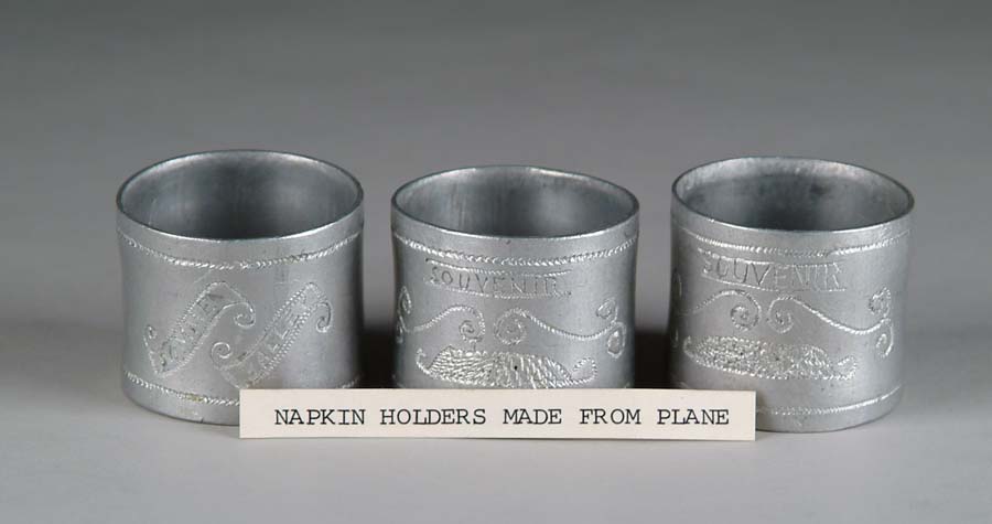 THREE NAPKIN RINGS MADE FROM THE FUEL INTAKE PIPES TAKEN FROM THE WRECKAGE OF VON RICHTHOFEN’S FOKKER TRI-PLANE DR I 425/17. Each ring is engraved “Souvenir” in a straight line and “Somme Valley” contained in two separate scrolls. Fuel intake pipes on the rotary engines were of aluminum and these napkin rings are of that material. The engraving is not of professional quality, but pleasing in a naïve manner. A photograph of the napkin rings appears on page 233 of Who Killed The Red Baron? CONDITION: One napkin ring is slightly dented on one end; the other two are undamaged. All three appear to be unpolished, but in the natural state of aluminum tubing. SIZE: 1-5/16” high x 1-11/16” diameter. From the Collection of the late P. J. Carisella. 4-53505 CW6 (1,000-1,200)