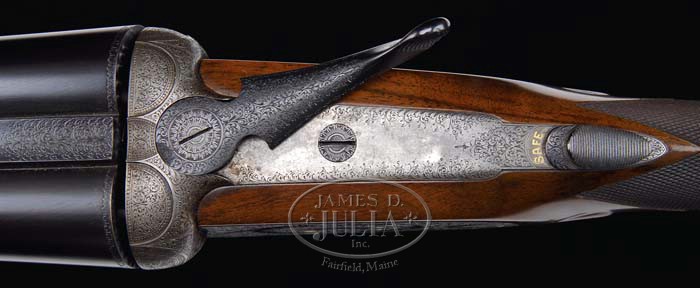 *W. W. GREENER SIDE LOCK EJECTOR L.60 GRADE GAME GUN. SN 56051. Cal. 12ga. 2-3/4″ Chambers. Double triggers. Automatic safety. 30″ Dovetail bbls are engraved “Sir Joseph Whitworth’s” on left bbl, and “Fluid Compressed Steel” on right. Concave game rib is engraved in scroll at breech and “W. W. Greener, Maker. 68 Haymarket London. Works St. Mary’s Square. Birmingham.” Bbl flats have Birmingham nitro proofs for 2-3/4″ chambers. Bottoms of bbls are marked w/ SN “56051” (1908), Greener elephant trademark, and Whitworth sheaf of wheat trademarks. Action has double under lugs, bushed strikers, and is engraved w/ SN, elephant logo, and proofs on water table as well as “W. W. G. England” on breech face. Nicely filed action has about 80% coverage of well executed small shaded scroll engraving w/ “W. W. Greener” on lock plates. Arcaded fences and top lever have matching scroll engraving, all the work of noted Greener engraver, Tomlinson (per factory letter). Tumbler ends have gold line cocking indicators. Trigger guard has scroll and SN in relief. Tip of trigger guard is engraved “Grade L 60”. “Safe” is inlaid in gold on top tang. Nicely streaked straight grip European walnut buttstock measures 14-1/8″ over an old Hawkins pad, and features large gold oval, drop points, and 26 LPI borderless checkering. Anson release splinter forend has checkering to match buttstock. Top of forend iron, bbl flats, water table and breech face are engine turned. Bore diameter: left -.736, right -.733. Bore restrictions: left -.036, right -.033. Wall thickness: left -.027, right -.025. Drop at heel: 2″, drop at comb: 1-1/2″. Weight: 6 lbs 13oz. PROVENANCE: Factory email letter with specifications. CONDITION: Very good. Bbls retain virtually all of good quality re-black. Action and lock plates have traces of orig case color, mostly silver gray. Trigger and top lever retain nearly all of their re-blue. Stocks have most of a varnish finish, edges slightly rounded. Checkering nicely re-cut. Bores are bright w/ some frosting throughout. Action is tight and on face. Ejectors are slightly out of time. Side lock Greener guns are seldom seen. 4-35885 MGM115 (7,000-9,000)