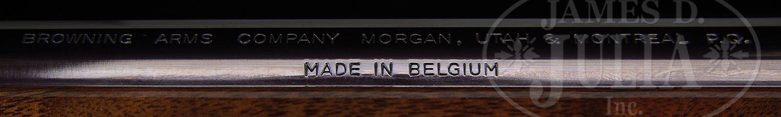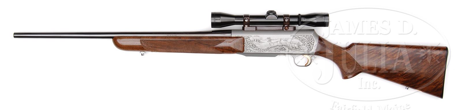 *BELGIAN BROWNING B A R GRADE IV WITH SCOPE. SN 71602M75. Cal. .270 Winchester. Standard configuration. No sights on bbl, which is marked “Made In Belgium”. French gray receiver is engraved with large foliate scroll flanking scenes of antelope and white tailed deer. Deer scene is signed by engraver, M. Bodson. Finely quilted figure walnut stocks feature point pattern engraving with bead carved borders having scrolled flourishes at ends. Buttstock is fitted with Browning buttplate, sling eyes, and a gold oval engraved “P”. LOP: 13-3/4″. A Browning 5X scope with crosshair reticle is in Browning mount on top of receiver. CONDITION: Excellent, all original, showing very little use with a few minor marks in wood mostly at right butt, and a few at toe. There is a slight mark on left side of action, right side slightly browned. Bore is excellent, bright and shiny throughout. Scope looks new, optics are clear. 4-47119 MGM9 (2,500-3,500)