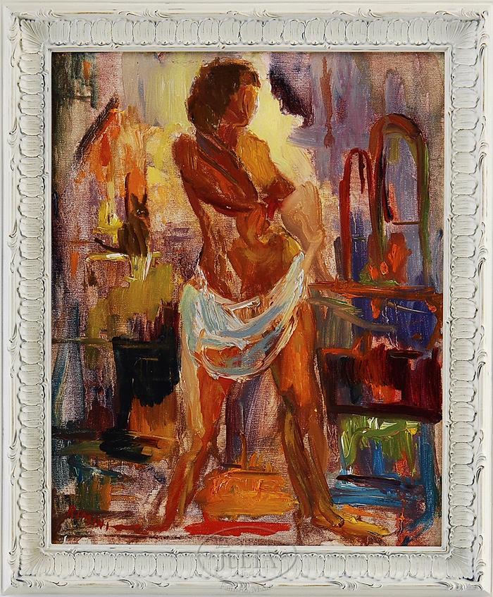 JOE RIMINI (American, 1920-2000) STUDIO NUDE. Oil on canvas study of a nude standing in a studio setting. Signed lower left “Rimini”. Housed in a modern white painted decorative frame. SIZE: 20″ x 16″. CONDITION: Very good. 9-97159 (300-500)