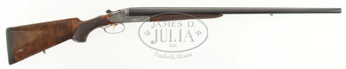 *RARE MARHOLDT-PETERLONGO DBL RIFLE & DBL BBL SHOTGUN. Cal. 348 Winchester & 12 ga. SN 4406-67.52. Beautiful boxlock, sideplate rifle/shotgun combination with 25-1/2″ rifle bbls with raised matted rib, ivory bead, caterpillar front sight on pedestal with 3-leaf express sight, one standing, two folding, with claw mounts & orig rings containing a Zeiss 1.5-4.5X Diavari-C scope. Shotgun bbls are 27-5/8″ choked MOD/MOD with tapered concave matted rib, dbl ivory beads. Both bbls have Greener extension, ejectors & dbl chopper lumps. Receiver has dbl triggers with front trigger being set. Receiver & sideplates have full coverage, very high quality, very deep relief engraving consisting of full sideplate scenes of a bull & cow moose in a forest scene on left side & a grizzly bear standing over his kill of a doe deer, in a forest scene on the right side. All surrounded by full coverage fine foliate arabesque patterns. Top tang has “SAFE” in gold & trigger bow has gold initials “FJD”. Triggers, cocking arms, firing pin bushings, ejectors & small parts are all gold plated. Mounted with very beautiful marble cake French or Circassian walnut with two long checkered splinter forearms & pistol grip stock having a carved & checkered wrist with cheekpiece, 14-1/4″ over a smooth solid pad. Grip cap has a checkered & engraved metal cover. Accompanied by its orig brown leather red felt lined trunk case compartment for all pieces & two sets of snap caps. All dimensions with shotgun bbls: Drop at heel: 2-1/2″, drop at comb: 1-1/4″. Bore restrictions: left – .011, right – .013. Wall thickness: left – .030, right – .036. Bore diameter: left – .711, right – .718. Weight: 6 lbs. 15.04 oz. CONDITION: Extremely fine, may have been fired but if so, very little. Bbls retain about all of their fine orig rust blue while receiver & sideplates retain most of their orig coin finish. Wood is sound with minor nicks & scratches & a few bruises on cheekpiece and retains most of a fine professionally restored finish. Mechanics are crisp, brilliant shiny bores. Case is equally fine with a slightly loose hinge. 4-59103 JR656 (12,500-17,500)