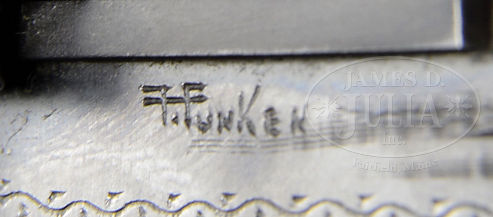 *FUNKEN ENGRAVED GRADE 3 16 GAUGE FABRIQUE NATIONALE A 5. SN 126635. Cal. 16 ga. 2-5/8″ Chamber. Produced at the end of the WWII, when all FN sporting production was allotted to servicemen, this interesting gun, with no markings on 27″ bbl with raised, matted rib, is engraved on left top of receiver “Capt. Sharon. S. Ulrey” in scrolled riband over FN nomenclature. Sides of action are engraved with game birds and dogs in open woodlands, with a pair of setters pointing group of ducks flushing from pond on left; and more setters pointing group of pheasants on right. Another flock of pheasants are flying along top right of action. This interesting engraving is by Felix Funken whose signature appears under magazine cut-off on left side of action. Nicely stump figured red-toned American walnut checkered, round knob buttstock measures 14-1/4″ over composition FN buttplate. Standard forend with finger grooves has matching checkering and wood. Drop at heel: 2-7/16″, drop at comb: 1-1/2″. Weight: 7 lbs. 14 oz. LOP: 14-1/2″. CONDITION: Excellent, as refurbished. Metal parts retain nearly all of a good quality re-blue. Stocks are new. Mechanically crisp. 4-49054 MGM193 (4,000-7,000)