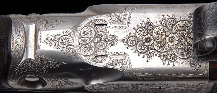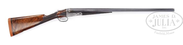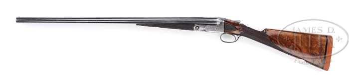 *RARE PARKER BHE GRADE 1-1/2 FRAME SIDE-BY-SIDE SHOTGUN. SN 132016. Cal. 12 ga. 28″ bbls, matted tapered concave rib with dual ivory sighting beads, 2-3/4″ chambers, IMP.Cyl/MOD chokes, ejectors and Miller sgl trigger. Rare 1-1/2 size receiver is special ordered B grade engraving with foliate Arabesque scroll and flower blossoms on each side with ribbon marked “Parker Bros”. Trigger plate also has foliate Arabesque scroll with flower blossoms. Mounted with nicely figured walnut, checkered side panels with fleur-de-lis dropper points, checkered straight grip stock, 1″ Silvers recoil pad, silver initial oval engraved “DSW” and fully checkered splinter forend. Bore diameter: left -.731, right -.732. Bore restrictions: left -.010, right -.008. Wall thickness: left -.032, right -.035. Drop at heel: 2-1/2″, drop at comb: 1-1/2″. Weight: 7lbs. 3oz. LOP 13-7/8″. This SN is not found in “Parker Gun Identification and Serialization” book. CONDITION: Fine, bbls retain 90-95% orig blue with muzzle wear, some fine nicks and scratches and thinning in chamber and forend area. Rub mark on bottom from forend. Receiver retains traces of orig case color, visible in protected areas, with balance a silver patina. Stock is sound with slightly flat checkering, numerous light nicks and scratches, small nick by lower tang at receiver and retains orig finish blending with a professional added finish near recoil pad. Forend is sound with slightly flat checkering, nicks and scrapes and retains orig finish blending with hand worn patina. Mechanics are crisp with non-automatic safety that is also trigger selector, strong ejectors and shiny bores with a couple small shallow pits in right bbl. 4-38759 BDT100 (10,000-15,000)