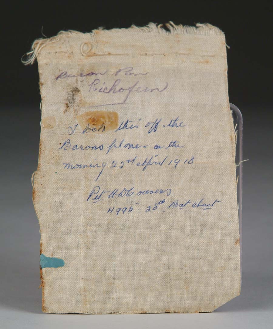 SECTION OF FABRIC FROM VON RICHTHOFEN’S FOKKER DR I TRI-PLANE. A substantial section taken from the upper surfaces of the tri-plane, with no evidence of the blue paint associated with fabric from the undersides. Written on the reverse is “Baron Von Richofern (sic). I took this off the Barons plane on the morning 22nd April 1918 Pvt H. W. Convers 4995-20th Bnt Aust”. On the red-painted surface are three signatures, one of which appears to be “Gabriel;” the others are illegible. CONDITION: Red/maroon in color, not faded and slightly frayed on the edges. SIZE: 6-1/2” x 4-1/4”. From the Collection of the late P. J. Carisella. 4-53520-1 CW22 (2,250-2,750)