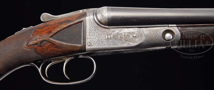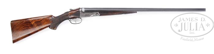 *SPLENDID PARKER BHE GRADE SIDE-BY-SIDE SHOTGUN. SN 184642. Cal. 20 ga. 25-7/8″ bbls, matted tapered concave rib with sgl silver sighting bead, 2-1/2″ chambers, MOD/MOD choke, ejectors and double triggers. Top of bbl is marked “Parker Bros. Makers. Meriden. Ct. U.S.A. Acme Steel”. Chamber end of bbls have geometric design border engraving. The “0” size receiver features beautiful B grade engraving with fine foliate Arabesque scroll and “Parker Bros” on each side, an oval with setter and pointer over flushing game bird, on left side a grassy scene with setter and pointer on triggerplate, 2 setters and flushing pheasant on right side. Balance of engraving is tight foliate scroll. Mounted with nicely figured dark streaky walnut with checkered side panels with fleur-de-lis dropper points, checkered pistol grip with hard rubber grip cap with gold initial oval in center. Checkered butt with steel skeleton buttplate and fully checkered splinter forend. Bore diameter: left – .623, right – .618. Bore restrictions: left – .018, right – .009. Wall thickness: left – .030, right – .037. Drop at heel: 2-3/4″, drop at comb: 1-9/16″. Weight: 6lbs. LOP 14″. Matting runs full length on rib, bbls do touch in front and chokes start approximately 3″ from muzzle. This SN is not found in “Parker Gun Identification and Serialization” book. The weight stamped on bbl flat is 2 lbs 15 oz. The bbls weigh 2 lbs 14.4 oz. PROVENANCE: Peter Wainwright Collection. CONDITION: Very good to fine, bbls retain 85-90% orig blue with minor muzzle wear, some minor nicks and scrapes and minor thinning in forend area with rub mark on bottom from forend. Receiver has 20-25% orig case colors, stronger in protected areas, blending with a silver patina. Trigger guard has flaked and worn to a silver patina. Stock is sound with moderately worn checkering, nicks, dings and scrapes and retains a lovely oil finish blending with hand worn patina. Forend is sound with moderately worn checkering and slightly filled, a few minor nicks and dings and retains an oil finish blending with hand worn patina. Mechanics are crisp with automatic safety, strong ejectors and nice shiny bores. 4-38181 BDT95 (7,500-12,500)