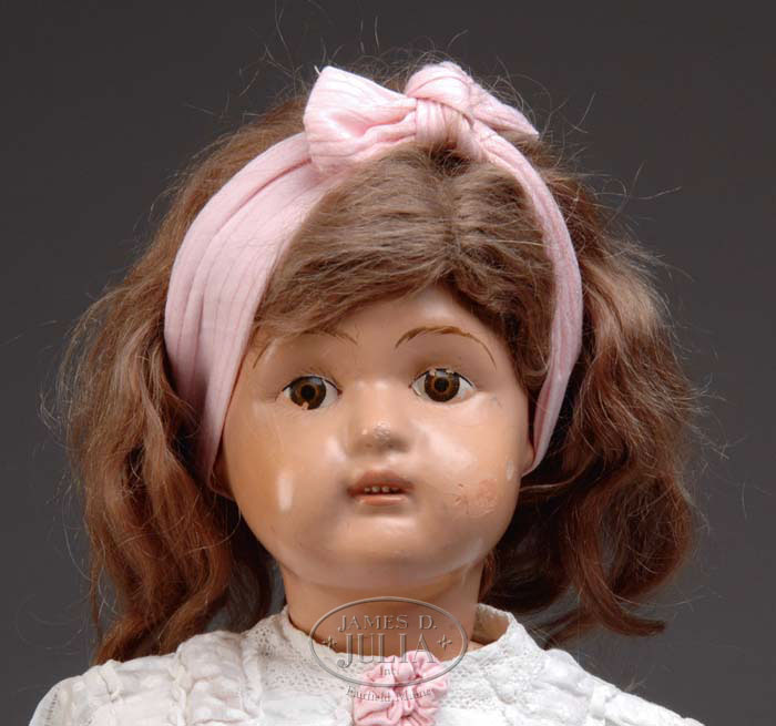 22″, (56 CM), SCHOENHUT “MISS DOLLY”. She has brown decal eyes, open/closed mouth with four teeth, and is wearing her original light brown mohair wig tied in a pink bandana. She has an impressed “Schoenhut” mark on the back of the torso. Her newer outfit is well-coordinated with the pink bandana in her hair and consists of a white dotted Swiss lace blouse with lace trim and shocking pink skirt with newer stockings and white leather shoes. CONDITION: Overall good paint condition, other than surface on nose, minor touch-up on lower left cheek, and a few chips on the decal around the eyes. 1-7493 RS (575-675) Auction: Advertising, Toy & Doll - Spring 2007 Please Note: All prices include the hammer price plus the buyer’s premium, which is paid by the buyer as part of the purchase price. The prices noted here after the auction are considered unofficial and do not become official until after the 46th day. |