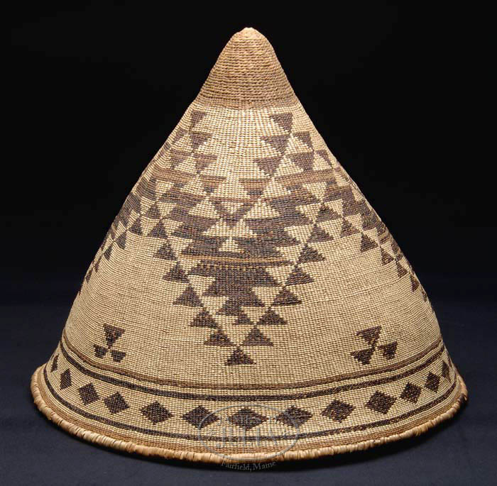 PITT RIVER BURDEN BASKET. The large cone shaped basket having a diamond decorated border with three lines, stepped design with triangles in dark color. Wrapped top edge. PROVENANCE: Ex-Greer Garson & “Buddy” Fogelson’s Forked Lightning Ranch Collection sold by W.E. Channing, 1991. SIZE: 19-1/2” dia. x approx. 16” tall. CONDITION: Very Good. 9-73359 (4,000-6,000)