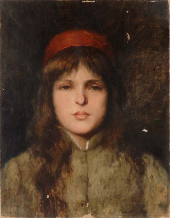 WILLIAM MERRITT CHASE (American, 1849-1916) GIRL IN RED CAP. Unframed oil on canvas portrait of a young girl with brown hair wearing a red cap. She wears a light olive shirt against a dark background. She looks directly at viewer. The back of the canvas has pencil signature. NOTE: This painting was in private hands and found in a closet and was unavailable and is not in the Catalog Raisonne. SIZE: 18” x 14”. CONDITION: Patch to reverse, small slit in upper right, a few areas of minor paint loss, otherwise very good. 9-73255 (5,000-7,000)
