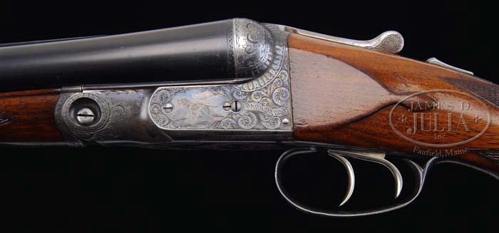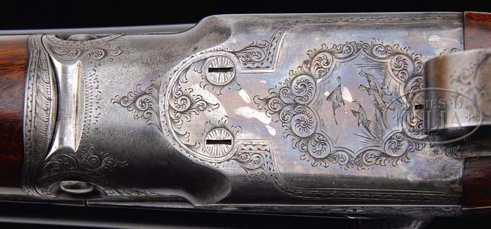 *DESIRABLE PARKER DHE GRADE SIDE BY SIDE SHOTGUN. SN 198146. Cal. 12 ga. 32″ titanic steel bbls, tapered matted concave rib with single brass sighting bead, 2-3/4″ chambers, FULL/FULL choke, ejectors and dbl triggers. Top rib of bbls are marked “PARKER BROS.MAKERS.MERIDEN.CT.U.S.A. TITANIC STEEL”. The No. 2 size frame is engraved in typical “D” style with oval and pointer on left side, oval with setter on right side, ribbon with “PARKER BROS.” on each side surrounded by foliate arabesque scroll. Trigger plate is engraved with four game birds, 2 in flight, 2 standing surrounded with fine foliate arabesque scroll. Mounted with nicely figured walnut, checkered splinter forend, checkered pistol grip with Parker Brothers hard rubber grip cap, side panels with dropper points, checkered butt with steel skeleton buttplate. The book “Parker Gun Identification and Serialization”, identify as Grade T13, with ejectors, capped pistol grip stock, 12 ga. 32″ bbls, Grade T13 is “D” grade with Titanic steel bbls. Bore diameter: left -.729, right -.729. Bore restrictions: left -.034, right -.034. Wall thickness: left -.037, right -.047. Drop at heel: 2-9/16″, drop at comb: 1-1/2″. Weight: 8lbs. 7oz. LOP 14″. CONDITION: Extremely fine. Bbls retain 90-95% orig blue with some minor thinning on left bbl blending to a purple patina, rub mark on bottom of bbls from forend, and a few minor light handling marks. Receiver retains 85-90% strong orig case colors thinning across bottom and blending with silver patina. Trigger guard has traces of orig blue but is mostly flaked and blending a brown patina. Stock is sound with good checkering, some minor nicks & dings & retains much of its orig finish, blending with hand worn patina in grip area. Skeleton buttplate has traces of orig blue but is mostly a blend of silver and brown patina. Forend is sound with good checkering, usual minor nicks & dings and retains orig finish, blending with hand worn patina. Mechanics are crisp with automatic safety, strong ejectors, and nice shiny bores. 4-37850 BDT168 (7,000-10,000)