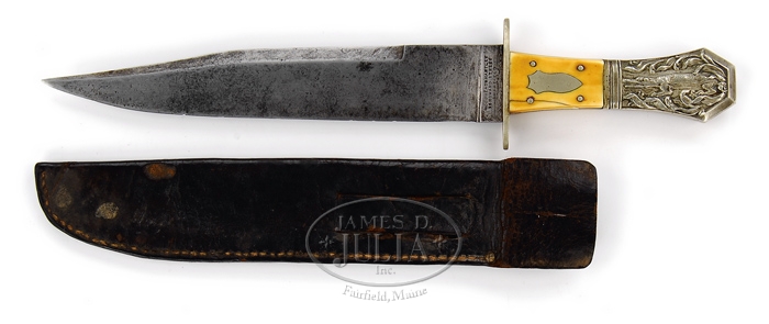 OUTSTANDING WOODHEAD & HARTLEY EARLY BOWIE KNIFE. Fine English Bowie from 1840’s-1850’s period with 8-15/16″ clip point blade, 1-1/2″ at ricasso with a 7-1/4″ back grind. It has a 3/16″ thick pointed oval German silver handguard with a coffin shaped handle of cast German silver that has stylized alligator pommel with ivory scales pinned with four German silver rivets and an elongated German silver shield on one side. Left ricasso is marked “WOODHEAD & HARTLEY / 36 HOWARD STREET / SHEFFIELD”. This knife is identical in shape but slightly larger than one pictured on p. 89 of the book Bowie Knives of the Ben Palmer Collection, Palmer, Moran & Phillips with identical handle as another pictured on p. 245 of the book The Antique Bowie Knife Book, Adams, Voyles & Moss. Page 257 of the same book has a nearly identical knife but with different pommel that differs only with the more common half horse-half alligator motif but with identical blade shape, ricasso marking & ivory scales. These knives were a staple of the American Frontier prior to Civil War made famous by the intrepid James & Rezin Bowie. No self respecting frontiersman, cowboy or gentleman of that era would be caught without his knife. Being without one’s knife could cost someone his life. This knife, given its fancy & probably costly appearance, mostly likely would have belonged to someone of importance and/or of reasonable means. Accompanied by a homemade 1-pc leather sheath with spacer in sewn back edge. CONDITION: Fine. Shows some sharpening with a few small chips in cutting edge and light to moderate pitting, moreso on right side. Left side grip panel is cracked, otherwise handle is very fine with beautiful gold to orange age patina. Sheath shows heavy wear and is dark & stiff. 4-31233 JR419 (17,500-27,500)