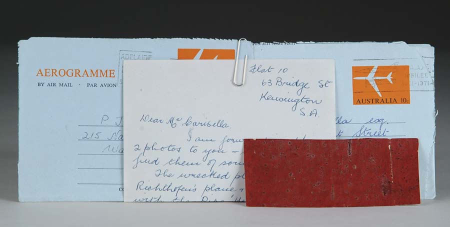 SECTION OF FABRIC FROM VON RICHTHOFEN’S FOKKER DR I TRI-PLANE, AND FOUR AUTHENTICATING LETTERS. A rectangular piece of fabric from the upper surfaces of the tri-plane. Written on the reverse in black ink, is “Fabric of the Famous German Aviator’s Machine Baron Von Ritchofen (sic) Brought Down 21-4-18. Somme Front. Lt. F. Mart” (in blue ink). The four letters mentioning the fabric were written by Erica A. Mart, Frank Mart’s widow. CONDITION: Good. Slightly spotted. SIZE: 4-5/8” x 1-7/8”. From the Collection of the late P. J. Carisella. 4-53520-2 CW23 (2,000-3,000)
