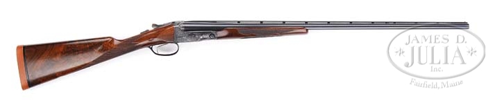 *VERY DESIRABLE REMINGTON PARKER DHE GRADE 28 GA SIDE-BY-SIDE SHOTGUN. SN 242064. Cal. 28 ga. 28″ bbls with matted tapered ventilated rib, dual ivory sighting beads, 2-7/8″ chambers, MOD/FULL chokes, ejectors and sgl selective trigger. The “00” receiver is standard late D grade engraved with foliate scroll and setter on left side, 3 pheasant on trigger plate and “Parker” across center of bottom and pointer on right side. Trigger bow is engraved with foliate scroll as well as border engraved and scroll around screws of long tang trigger guard. Mounted with nicely figured feathercrotch walnut, side panels with dropper point, checkered straight grip, solid red Silvers pad with peak, gold initial oval with border engraving and faint scroll. Barrel flats are marked with the Remington date code “XJ” for December 1940. Checkered beavertail forend. Bore diameter: left – .554, right – .554. Bore restrictions: left – .020, right – .010. Wall thickness: N/A. Drop at heel: 2-5/8″, drop at comb: 1-1/2″. Weight: 6 lbs. 7 oz. LOP 14″. This SN is too late for the “Parker Gun Identification and Serialization” book. PROVENANCE: Dr. David Rozier Collection. CONDITION: Extremely fine, gun appears to be test fired only. Bbls retain 99% of factory blue with just a few minor nicks and scrapes. Receiver retains 97-98% of its Remington case colors, some light thinning across trigger plate and over fences. Stock is sound with a few minor handling marks, crisp checkering and retains virtually all of its Remington finish. Forend is sound with some minor handling marks and a couple shallow dents on rear right portion, strong colors on release latch and retains most of its Remington finish. Mechanics are crisp with automatic safety, strong ejectors and bright shiny bores. 4-38342 BDT83 (30,000-50,000)