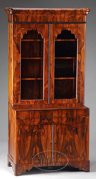 EXCEPTIONAL CLASSICAL ROSEWOOD BOOKCASE SECRETARY, PROBABLY NEW YORK. Circa 1830. The bull-nose molded cornice with concave frieze above the conforming upper case fitted with a pair of Gothic-arched doors, opening to three adjustable shelves above the lower case having a hinged compartment, opening to form a baise-lined writing surface flanked by open compartments and exposing three aligned document drawers, above a pair of figured Gothic panel doors, raised on bracket feet with shaped and scalloped returns. SIZE: 90-1/2″ h. x 42-1/2″ w. x 23″ d. PROVENANCE: From an extensive private Gulf Coast collection. CONDITION: Very fine professional restoration and finish, with exceptional graining. Retains original backboards and old glass. Some minor veneer losses at cornice and feet. Otherwise very good overall. 9-93531 (4,000-6,000)