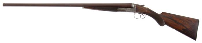 COLT MODEL 1883 DOUBLE BARREL SHOTGUN. Cal. 12 ga. SN 2863. Field grade Colt with 30”, fine pattern, Damascus bbls choked IMP-MOD/IMP-MOD with smooth, concave rib, sgl bead, doll’s head extension, extractor & dbl triggers. Mounted with very nicely figured French or circassian walnut with black insert semi-schnable tipped, checkered forearm and rnd knob, semi-pistol grip stock, 13-3/4” over a rampant Colt hard rubber buttplate. Receiver is lightly engraved with patent date on floorplate. Stock has a blank silver oval initial plate on bottom. Bore diameter: left – .723, right – .723. Bore restrictions: left – .017, right – .016. Wall thickness: left – .026, right – .028. Drop at heel: 3-5/8”, drop at comb: 1-15/16”. Weight: 7 lbs. 4.48 oz. CONDITION: Fine. Bbls retain about 98% of a restored chocolate brown Damascus finish. Receiver & triggerguard are silvered case colors mixed with brown patina. Stock has a couple of fine cracks on right side panel with some wood filler at receiver on both sides and other wood filler on bottom by trigger plate, otherwise wood is sound and retains about all of a fine professionally restored finish with freshened checkering. Mechanics are fine, bright shiny bores with fine pitting in left side, probably re-honed. 4-59216 JR52 (1,000-2,000)