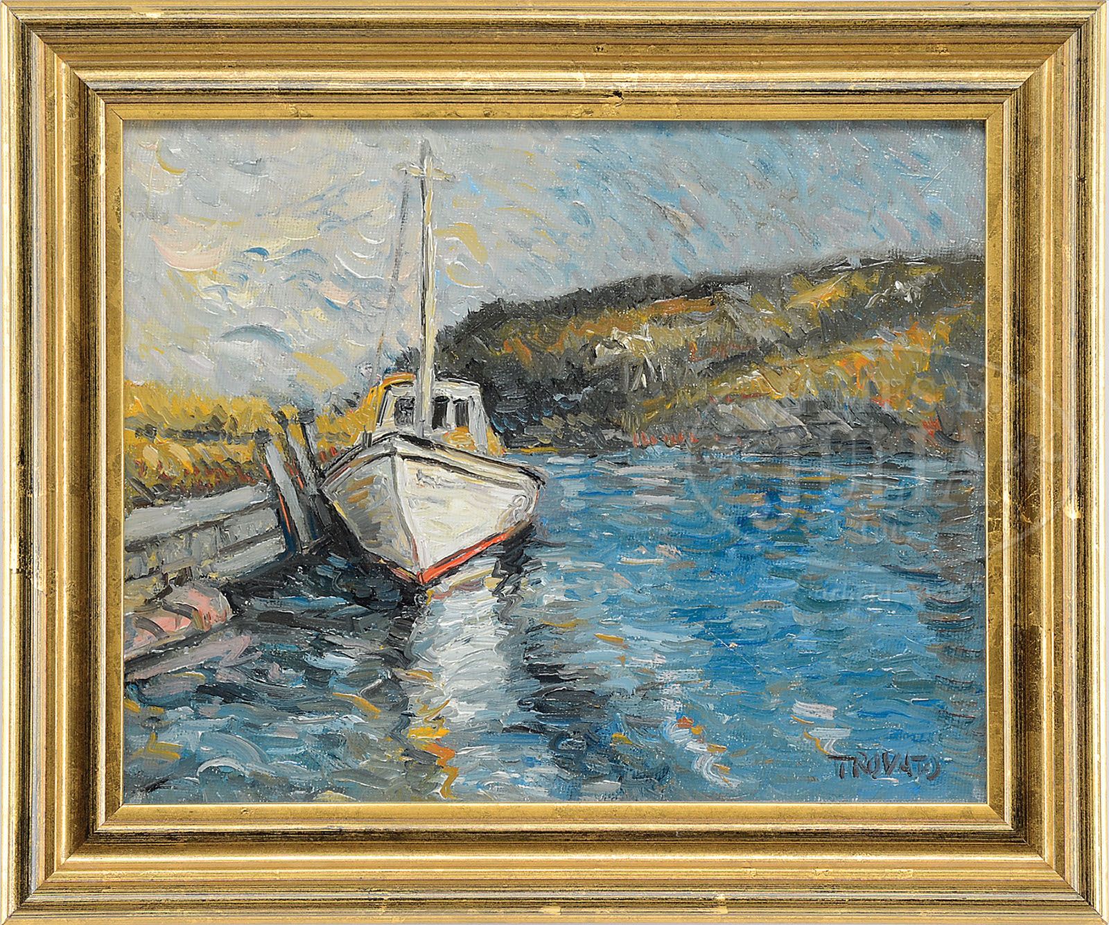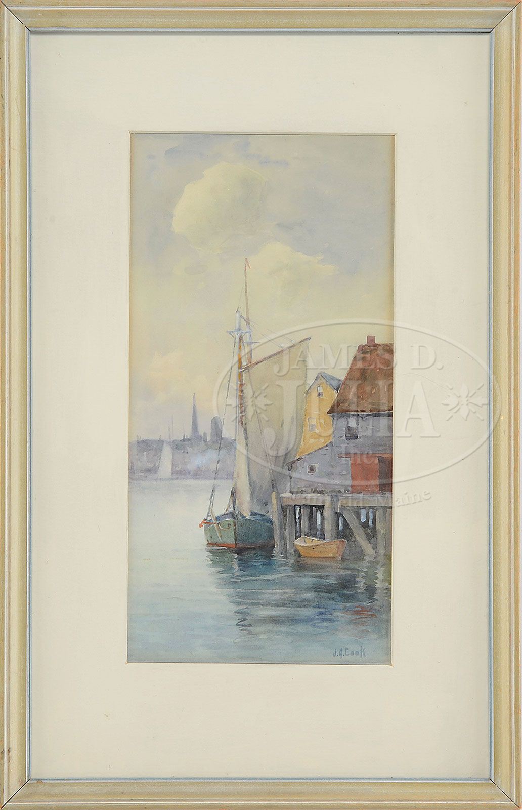 THREE WORKS. 1. MIKE TROVATO (American, 20th century) AT THE DOCK Oil on canvas. Housed in modern gilt frame Signed “Trovato”, lower right 2. JOHN A. COOK (American 1870-1936) GLOUCESTER PIER Watercolor on paper Housed in a painted molded wood frame, with matte behind glass Signed “J.A. Cook”, lower right 3. UNSIGNED, 20th century TWO FIGURES ON PARK BENCH Watercolor on paper Housed in a modern gilt frame with matte behind glass SIZE: 1. 8″ x 10″. Overall: 10-1/4″ x 12-1/4″. 2. 13-1/4″ x 6-1/2″. Overall: 20-1/4″ x 13″. 3. 6-1/2″ x 4-1/2″. Overall: 15″ x 13″. CONDITION: Very good. 7-70193 (300-500)