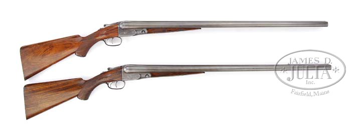 RARE FACTORY ORDERED PAIR OF PARKER DH GRADE SHOTGUN WITH CASE. SN 68749 & 68750. Gun 1) Cal. 12 ga. 30″ Damascus bbls, matted tapered concave rib, with single silver sighting bead, 2-9/16″ chambers, MOD/IMP-CYL choke, extractors, and dbl triggers. No. 2 size frame with standard D grade engraving with pointer in oval on left side, setter on right, ribbon with Parker Bros on each side surrounded by foliate arabesque scroll, trigger plate is engraved with four game birds, surrounded by foliate arabesque scroll, balance of engraving is foliate arabesque scroll. Top lever is fish-tail style, mounted with streaky walnut, checkered splinted forend, checkered pistol grip with hard rubber grip cap, side panels with dropper point, checkered butt with steel skeleton buttplate. Bore diameter: left -.736, right -.736. Bore restrictions: left -.022, right -.030. Wall thickness: left -.034, right -.034. Drop at heel: 3-1/8″, drop at comb: 2″. Weight: 8lbs. 3oz. LOP 14-3/16″. Gun 2) Cal. 12 ga. 30″ Damascus steel bbls, matted tapered concave rib, with dual silver sighting beads, 2-3/4″ chambers, MOD/FULL chokes, extractors, and dbl triggers, No. 2 size frame, is typical “D” grade engraved oval with pointer on left side, setter on right side, ribbon with “Parker Bros.” on each side, surrounded by foliate arabesque scroll, trigger plate is engraved with four game birds surrounded with foliate arabesque scroll. The remainder of engraving is an foliate arabesque scroll. Top lever is fish-tail style. Bore diameter: left -.733, right -.731. Bore restrictions: left -.025, right -.027. Wall thickness: left -.037, right -.037. Drop at heel: 3-1/4″, drop at comb: 2″. Weight: 8lbs. 3oz. LOP 14-3/16″. Guns are accompanied by Parker Collector Association factory letters identifying guns as being ordered July 25, 1891 and shipped on November 5, 1891 to Van Denburg’s Bros. of Finley, OH. They both have 30″ Damascus bbls, with capped pistol grips. Gun 1 has a LOP of 14-1/4″; a drop at comb 2″; drop at heel 3-1/2″; and weight 8-1/4lbs. Requested pattern was right hand 320 (pellets); left hand 280 (pellets). Gun 2, specs are LOP 14-1/4″; drop at comb – 1-3/4″; drop at heel 3″; and weight 8-1/4lbs. Pattern requested, right hand 280 (pellets) and left hand 320 (pellets. There is also a letter from the Hancock Historical Museum of Finley OH, detailing the Van Denburg Bros. of the late 1800’s. CONDITION: Gun 1) Fine. Bbls retain a thinning gray/brown Damascus pattern with a few minor nicks & scrapes and a few spots of dark brown. Receiver retains traces of orig case colors, but is mostly a brown blended with silver patina. Stock is sound with slightly worn checkering, some typical nicks & dings and retains a hand rubbed restored oil finish. Forend is sound with moderately worn checkering, usual nicks & dings, and retains a hand rubbed oil finish. Mechanics are good with auto-safety, shiny bores with a few shallow pits in both bbls. Gun 2) Very good, bbl retains a silver Damascus pattern thinning with a few small spots of dark coloration. Receiver retains 10-15% orig case colors, strong in protected areas, blending with a silver and brown patina. Stock is solid with nicely re-cut checkering, a couple small chips on left side of trigger guard, usual nicks & dings and retains a hand rubbed oil finish. Forend is sound with nicely re-cut checkering, some minor bumps & bruises and retains a hand rubbed oil finish. Mechanics are good with disabled safety, nice shiny bore, with minor dent at muzzle of right bbl. Accompanied with a leather 2-gun case with burgundy felt interior. 4-35270 BDT234 (7,500-12,500)
