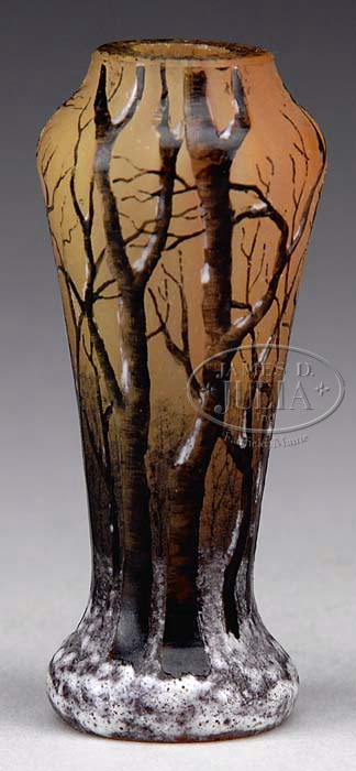DAUM NANCY MINIATURE VASE. Acid etched and enamel winter decoration. Nicely detailed. Black spotted enameled top rim. Enamel signature on the underside “Daum Nancy” with the Cross of Lorraine. SIZE: 2-1/4” t. CONDITION: Very good to excellent. 5-68563 (1,200-1,500)