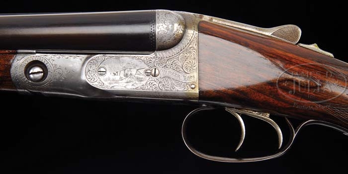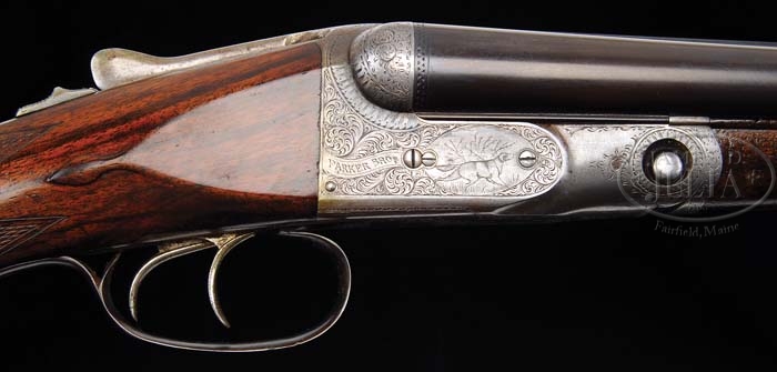 *PARKER DH GRADE SIDE-BY-SIDE SHOTGUN. SN 115877. Cal. 16 ga. 26″ bbls, tapered matted concave rib with sgl silver sighting bead, 2-9/16″ chambers, IMP.Cyl/MOD chokes, extractors and double triggers. Top rib of bbl marked “Parker Bros. Makers. Meriden. Conn. Titanic Steel”. The “O” size receiver is standard B grade with foliate scroll, ribbon with “Parker Bros” on each side, oval with pointer on left, 4 flying game birds on trigger plate and setter on right side. Mounted with streaky straight grain walnut, side panels with dropper points, checkered ball grip, checkered butt with steel skeleton buttplate, blank gold initial oval and checkered splinter forend. Bore diameter: left -.664, right -.663. Bore restrictions: left – .016, right -.005. Wall thickness: left -.041, right -.043. Drop at heel: 2-3/8″, drop at comb: 1-1/2″. Weight: 6lbs. 8oz. LOP 13-3/4″. “Parker Gun Identification and Serialization” list as T13 grade which is D with Titanic bbls, no options, 16 ga with 26″ bbls and pistol grip stock. CONDITION: Fine, bbls retain a restored blue finish that is toning and blending with brown patina, some minor nicks and scrapes and a tiny dent on left bbl about 8″ from muzzle. Receiver retains traces of orig case colors, mostly in protected areas, and carries a balance of smooth silver blending with brown patina. Rear of receiver and top tang have traces of a thin coat of stock finish. Stock is sound with nicely recut checkering, some minor nicks and scrapes, and retains a fine hand rubbed restored finish. Mechanics are crisp with automatic safety, shiny bores with a couple small shallow pits in left bbl. 4-38804 BDT99 (4,500-7,500)