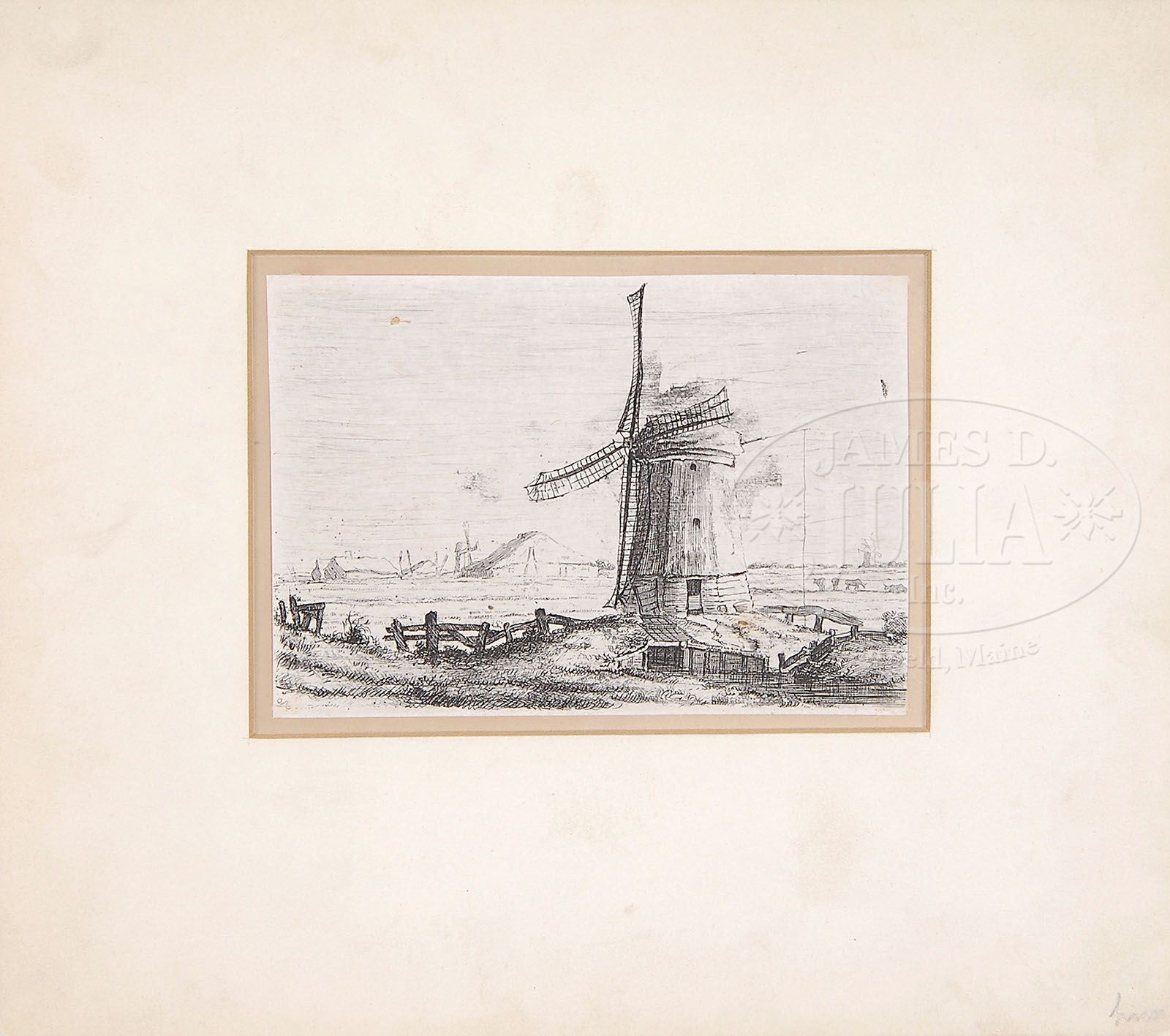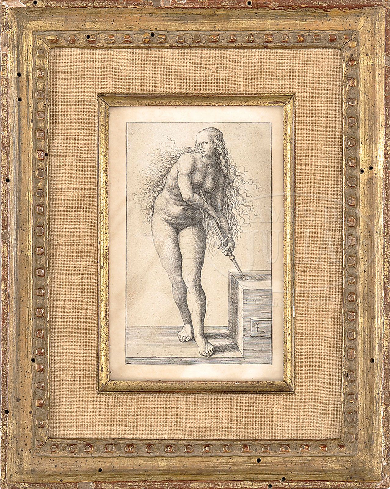 TWO EARLY ENGRAVINGS. 1) Possibly by Rembrandt Housed in a matte 2) Unsigned engraving of woman with a sword Housed in a decorative gilt frame with liners and glass SIZE: 1) 4-1/4″ x 6″. 2) Sight: 5″ x 3-1/4″. Overall: 9″ x 7″ PROVENANCE: Private Montclair, NJ home CONDITION: Generally very good 9-28247-1 (200-400)
