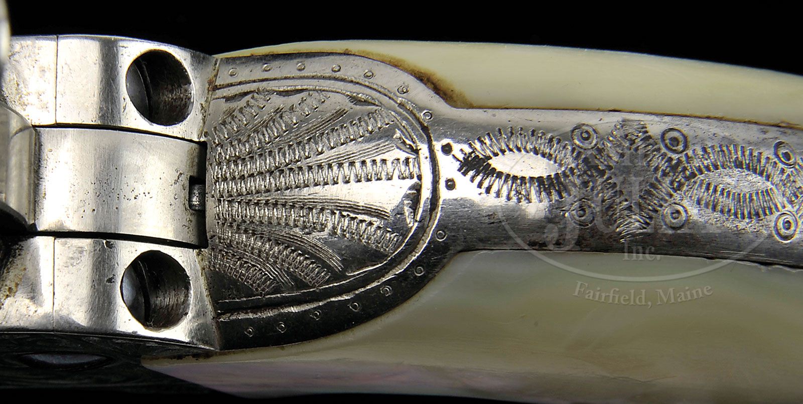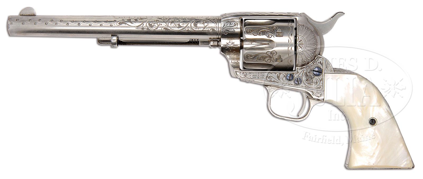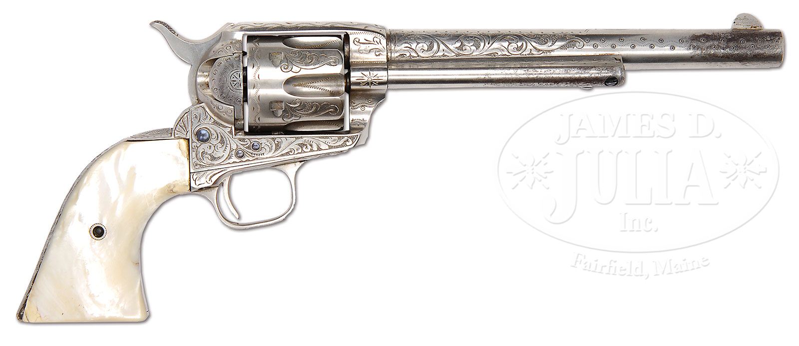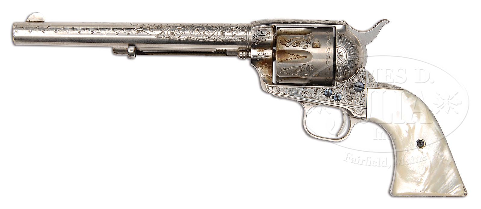 RARE EARLY NIMSCHKE ENGRAVED COLT SINGLE ACTION ARMY REVOLVER. SN 87320. Cal. 45 Colt. Nickel finish with 7-1/2″ bbl, full front sight and 1-line block letter address. Left side of the frame has 3-line patent dates and the left front web of the trigger guard is marked with the caliber. Mounted with smooth 2-pc pearl grips. Revolver is engraved by L.D. Nimschke with foliate arabesque patterns on sides of frame, a large flower blossom on left recoil shield and a smaller version on the loading gate. Sides of the ejector housing boss and base pin boss are engraved in hunter’s stars with snake & dot patterns in the front gullets. Top strap is engraved in a leaf & vine pattern. Matching foliate arabesque patterns extend about half way up the sides of the bbl with the forward half engraved in snake & dot patterns and geometric patterns around the address. Top gullet of the ejector housing is engraved in snake & dot pattern. Back strap, butt strap & trigger guard are engraved in zig zag geometric patterns with a fan pattern at the top of the back strap. Cyl is engraved with foliate arabesque patterns on the lands between the flutes and zig zag patterns in the flutes with a snake & chip border pattern around the rear edge. Base pin is first type with dimpled ends and screws are fire-blued. Accompanied by a Colt factory letter which identifies this revolver in caliber 45, bbl length not listed, nickel finish, type of stocks not listed, factory engraved and shipped to Wexell & DeGress, Mexico City, Mexico on Feb. 7, 1883 in a 6-gun shipment. Undoubtedly this revolver would have been intended for presentation to a high ranking official in Mexico or was purchased by a wealthy ranch owner down there. It is very rare to find any firearm returning from Mexico with high orig finish such as this one. PROVENANCE: John Stewart Collection. CONDITION: Very fine. Bbl & ejector housing retain 90-92% strong orig nickel with a dark area on right side of front sight at the muzzle and some wear on the outer radius of the ejector housing; frame retains virtually all of its strong orig nickel with the loading gate showing a gray metal patina; hammer retains virtually all of its orig nickel; cyl also retains about all of its orig nickel turned a little milky; trigger guard retains about all of its orig nickel with some dulling on the front of the trigger plate & trigger bow; back strap is mostly a light gray metal patina with bright nickel at the top. Right grip has a repaired heel, otherwise grips are sound and retain great fire & iridescent color. Mechanics are crisp, sharp bore with good shine and scattered pitting that may clean much better. 4-48149 JR306 (50,000-75,000)