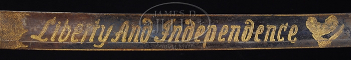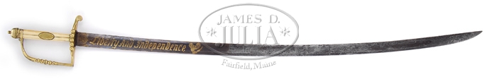 RARE INSCRIBED SWORD OF JOHN SHAW, USS ENTERPRISE. This beautiful sword is a standard 5 ball, urn pommel pattern made from gilted brass and fluted bone grip. An unusual feature of this sword is a small, inset, gilted anchor approx. 1/4″ tall. A presentation plaque in grips reads “Comm. Jno. Shaw Sc Enterprise.” 36″ blue and gold blade exhibits the motto “Liberty and Independence” in a 9″ panel. Reverse panel reads “United States of America” with an early 19th century style American eagle surrounded by 16 stars (the 16th state Tennessee became a state in 1792). Our consignor states the following history: “JOHN SHAW, U.S. NAVY. This is a typical pattern British or American naval officer’s sword of the late 18th-early 19th century. It has a pillow pommel with a fluted ivory grip and gilded mountings. Typical of the period is the ‘5 Ball’ decoration on the guard and knuckle bow. Inset into the guard is a small fouled anchor. The imported blade is about 36″ long, has a wide fuller, and is blued with gold inlay in the etching for about 13” of its length. The words “Liberty and Independence” are etched on the obverse and on the reverse “United States of America”. There is also a heraldic American Eagle with 16 stars on its shield on the reverse. The number of stars is an indication of the date of manufacture but not always absolute. (The 16th state, Tennessee, entered the Union in 1796 and the 17th state, Ohio, in 1803.) This, together with the features mentioned above, would seem to place the date of manufacture between 1796 and 1803. There is, however and additional piece of information that helps date the sword. Inlaid into the ivory grip is an oval disk upon which is engraved “COMM/Jn-Shaw/Sc ENTERPRISE”. John Shaw was born in Ireland in 1773 and immigrated to the United States in 1791, settling in Philadelphia. He went to sea, and after 4 lengthy voyages was, (in the spring of 1798), appointed lieutenant in the young U.S. Navy. The “Quasi War” with France was then heating up and the Navy was in process of rebuilding after a protracted period of inactivity. Shaw was ranked about number 30 in seniority, rating above Chauncy and Decatur. His first station was U.S.S. Montezuma as first lieutenant. After a cruise to the West Indies, in October of 1799, Shaw was posted to command the newly constructed 12 gun sloop U.S.S. Enterprise. In December 1799 he put to sea for what was to become one of the most successful cruises in American naval history. Over the next 8 months he recaptured eight American ships that had been taken by the French and took nine French privateers, most of equal or greater size than Enterprise. Shaw later reported “I have in my last cruise made 300 prisoners, killed and wounded 61 men, taken 42 pieces of artillery and 180 stand of musketry which is more than I could have contemplated.” Shaw’s health was not good and he was relieved and returned to Washington arriving in January 1801 when he was thanked by President John Adams for his services. It logically would seem that at about this time either Shaw had made or was given this sword to commemorate his successful cruise. It is possible, of course that Shaw might have purchased the sword when he was first appointed lieutenant in 1798. It is most probably that the sword was made sometime between 1798 and 1803. Shaw later commanded 1801: U.S.S. George Washington; 1805: U.S.S. John Adams; 1806: Naval Station New Orleans; 1808: Naval Station Norfolk; 1810: New Orleans; 1814: U.S.S. United States; 1815: Commander in Chief Mediterranean Squadron; 1818: Naval Station Norfolk; 1819: U.S.S. Independence. Shaw died in 1823. -A History of the United States Navy from 1775 to 1894 Edgar Stanton Maclay D. Appleton & Company 1897. Copyright Stanley B. Smullen 111 11/11/05 U.S. NAVY SCHOONER ENTERPRIZE (12). The outbreak of the Quasi-War with France in 1798 found the U.S. Navy with very few vessels in commission and ready for sea. As a result, eight revenue cutters were reassigned to the Navy, merchantmen were purchased and armed, and new vessels were contracted out to civilian yards. Built on Maryland’s Easter Shore by Hugh Spencer, ENTERPRIZE was launched and commissioned in December 1799. She was the third vessel to bear this name in the Navy. With Lt. John Shaw, U.S. Navy, as her first commander, the new topsail schooner was immediately ordered to Commodore Morris’ squadron in the Caribbean. The mission was to suppress French privateers preying on American merchantmen. During the following eight months Shaw and his command re-captured eleven American ships and took thirteen French privateers. This record made the ENTERPRIZE the most successful vessel on the station in counteracting French predation on our merchant service. In recognition of this exemplary cruise, the ENTERPRIZE was the only small vessel retained by the Navy during the severe cutbacks at the end of the war in 1801. Another result of her success as a cruiser and her reputation as a fast and handy vessel, in 1803 her lines were taken-off to be used for the newly authorized schooner VIXEN. ENTERPRIZE had a relatively long and successful career. She served in the Mediterranean during the Barbary Wars and in the War of 1812 made several notable captures. The most famous at the time, was the taking of the British brig BOXER(12). This action occurred off Portland, Maine on 5 Sept. 1813, with both captains being killed during the fight. By 1815 ENTERPRIZE was back in the Mediterranean, attached to Bainbridge’s squadron. In 1817 she was ordered to the Caribbean once again for the suppression of piracy, and during the following five years took another thirteen prizes. Her career ended abruptly on 9 July 1823, when she was wrecked on Little Curacao Island, but all hands were saved. She was commanded by other notable officers such as Lieutenant Andrew Sterett, Isaac Hull, Stephen Decatur, and William Burrows. No plans have ev
