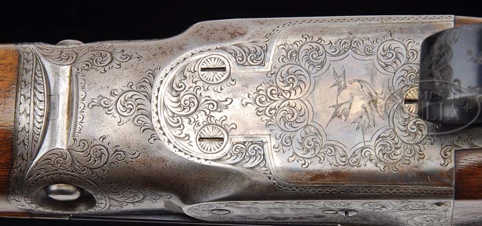 *PARKER DHE GRADE SIDE-BY-SIDE SHOTGUN. SN 174427. Cal. 12 ga. 30″ bbls, matted tapered concave rib with sgl silver sighting bead, 2-9/16″ chambers, FULL/FULL chokes, ejectors and double triggers. Top rib of bbl marked “PARKER BROS. MAKERS. MERIDEN. CONN. TITANIC STEEL”. The “2” size receiver is usual D grade engraved with foliate scroll and ribbon with “PARKER BROS” on each side, oval with pointer on left, 4 pheasant on trigger plate, oval with setter on right with balance a foliate scroll. Mounted with streaky straight grain walnut, side panels with dropper points, checkered straight grip, checkered butt with skeleton buttplate, blank gold initial oval and checkered splinter forend. Bore diameter: left – .734, right – .734. Bore restrictions: left – .036, right – .036. Wall thickness: left – .037, right – .047. Drop at heel: 2-1/8″, drop at comb: 1-1/2″. Weight: 7 lbs. 11 oz. LOP 14-1/2″. This SN is not found in “Parker Gun Identification and Serialization” book. CONDITION: Very fine, bbls retain 98% factory quality rust blue with a few minor handling marks. Receiver retains 70% orig case colors blending with silver and brown patina across bottom and over fences. Trigger guard retains 99% of factory quality rust blue. Stock is sound with tiny chip behind top tang, nicely freshened checkering, a few minor nicks and dings, hairline crack on both sides of toe at buttplate, a small repaired chip at toe of buttplate, and retains nearly all of a fine professional hand rubbed finish. Forend is sound with slightly flat checkering, a few minor nicks and dings and retains a thin coat of added finish blending with hand worn patina. Mechanics are crisp with automatic safety, strong ejectors and nice shiny bores. 4-38796 BDT102 (6,000-8,000)