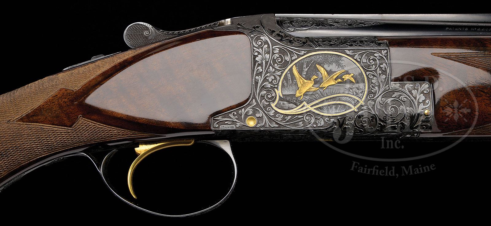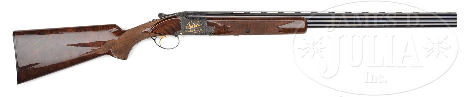 *BAERTEN ENGRAVED BROWNING SUPERPOSED MIDAS GRADE WITH CASE. SN 59521V70. Cal. 20 ga. 3″ Chambers. 26-3/8″ Ventilated rib bbls are marked with typical Browning nomenclature, and “MADE IN BELGIUM” on top bbl. There are triangles of open, shaded scroll on ends of bbls and ejector bosses. Bbls are marked for improved cylinder and modified chokes. Typical blued action is engraved with very well cut, open, shaded acanthus scroll with gold wire surrounding semi-relief gold inlaid vignettes of game birds on each side; pheasants on left, ducks on right. A gold inlaid quail flits across bottom of action. This well done engraving is signed by “J. Baerten” on left side bottom rear of action. Very fine full feather crotch claro walnut long tang, square knob buttstock measures 14-1/4″ over black composition Browning buttplate. Modified point pattern wraparound checkering at grip has flourishes into butt. Rounded one piece forend matches buttstock well. Drop at heel: 1-15/16″, drop at comb: 1-1/4″. Weight: 6 lbs. 4 oz. LOP: 14-1/4″. Tan vinyl Browning leather case has oval brass medallion on lid, is lined in faux fur, and contains instruction booklet and a key. PROVENANCE: Factory letter with specifications for this gun relating that it sold in 1976 for $2120.00, and was shipped to Tideland Sporting Goods in Easton, MD. CONDITION: Excellent, near new, with light cartridge head halos on breechface, and a few light handling and assembly marks on wood and metal. Checkering remains light in color. Mechanically crisp. Case is excellent, with some light areas of soiling. Interior is excellent, side of bbl partition is stained with what looks to be black ink. Instruction booklet envelope is slightly tattered and creased. 4-49166 MGM254 (14,000-19,000)