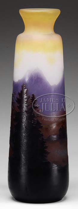 MONUMENTAL GALLE SCENIC VASE. Spectacular Galle vase has central large cameo pine tree in dark brown with purple-blue mountains in the background. Cameo decoration completely encircles the vase and is set against a background sky of frosted white shading to yellow. Signed on the side in cameo “Galle”. SIZE: 19-3/4″ t. CONDITION: Very good to excellent. 5-69511 (8,000-12,000)