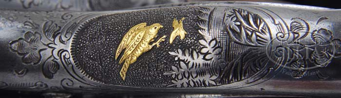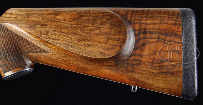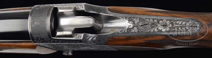 *W. J. JEFFERY FARQUHARSON SINGLE SHOT RIFLE WITH ARNOLD GRIEBEL ENGRAVING. SN 16425. Cal. 577 3″ Nitro. This rifle is built on what Wal Winfer in BRITISH SINGLE SHOT RIFLES, VOL. 3, describes as a Jeffery no. 4 action. He says he has only been able to obtain details on two of these actions. This particular action came from Jeffery Rifle number 16425, and was produced in 1904. Its history over the years is well documented, as it has been photographed and described in many magazine articles. It started life as a 450 3-1/4″ and has since been re-barreled a number of times. Present 25″ round barrel has one standing, 3 folding express sight, dovetailed into an elliptical block, and banded front w/ silver bead. Sling loop is soldered to bottom of bbl. Consignor states that the bbl, sights, and associated work was fitted by noted gunsmith, Alfred Gallifant, and coordinated by Paul Hodgins. It is marked “.577 – 3 Inch NE” on top at rear. Action has been beautifully engraved over its entire surface by famed engraver Arnold Griebel, and pictured in the first GUN DIGEST TREASURY, and originally under gun engraving in the 1956 GUN DIGEST. This rifle is also pictured in Jonathan Kirton’s THE BRITISH FALLING BLOCK BREECH LOADING RIFLE from 1865. Right side of the action features open flowing shaded acanthus scroll w/ relief scene of dogs worrying rabbits. Left side depicts a lion about to pounce on an antelope in jungle environment. Operating lever has gold inlaid vignette of falcon stooping onto hapless duck, flying over a marsh. Remainder of action is in-filled w/ matching acanthus scroll. This action features a safety button mounted on right side of trigger guard, which is unique as far as all writers chronicling single shot rifles are concerned. Beautifully streaked and nicely figured French walnut buttstock measures 14-1/2″ over very fine leather covered pad, and features a very well shaped shadow line cheek piece, and approx 22 LPI borderless checkering. Buttstock also has checkered steel grip cap and sling eye. Full forend is attached to bbl w/ 2 screws, features an ebony tip, and finely executed point pattern checkering and wood to match buttstock. Drop at heel: Approx 2-1/4″, drop at comb: approx 1-3/4″. Weight: 11 lbs 8oz. PROVENANCE: Cover letter from consignor, copies of articles in Gun Digest, and page from Kirton. CONDITION: Excellent. Bbl retains virtually all of its high polish rust blue. Action retains most of its blue, pleasingly silvering on high points. Stocks retain most of their oil finish, somewhat dull on buttstock. Checkering is sharp and clean. There is an area of repair through grip. Action is tight. Lever slightly loose. Bore, bright and shiny, appears test fired only. Superb big bore rifle with lots of history. 4-87612 MGM66 (10,000-15,000)