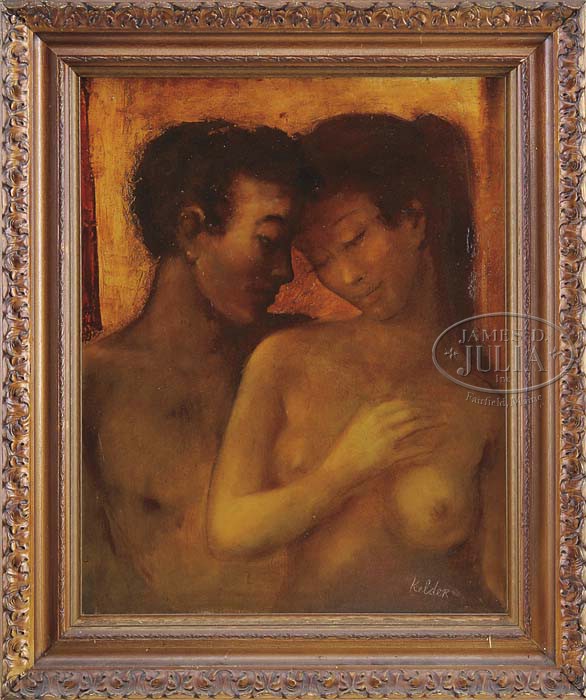 TOON KELDER (Netherlands, 1894-1973) THE LOVERS. Oil on canvas mounted to board half portrait of a young man & woman nude standing beside each other. They look affectionately at each other. Signed lower right “Kelder”. Housed in a period bronze decorated frame. SIZE: 30″ x 24″. CONDITION: Discolored varnish, very good. 9-24953 (800-1,000)