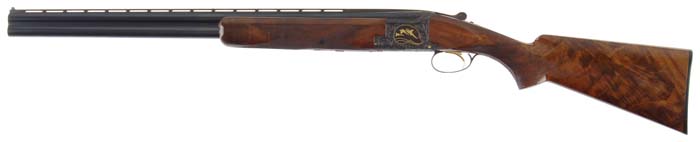 *BROWNING MIDAS GRADE OVER/UNDER SHOTGUN. Cal. 12 ga. SN 69520S7. Beautiful Browning with 26-3/8” bbls choked SKEET/SKEET with flat, matted, ventilated rib, dbl ivory beads, ejectors & gold plated, sgl selective trigger. Mounted with spectacular, burl & flame grain, center crotch cut walnut with checkered, field style, rnd forearm and long tang, flat knob stock with raised side panels & spear point checkering, 14-1/4” over a Browning black composition buttplate. Receiver is engraved by Arno and signed on both sides. Left side has three raised gold pheasants, right side three raised gold ducks & the bottom a raised gold quail, all surrounded by foliate arabesque patterns with stippled background. Triggerguard, opening lever & forend iron are engraved to match. This shotgun falls within the salt gun range and there appears to be a few spots of fine pitting where the wood touches the metal, especially around the lower rear edges of receiver. It is very likely that the wood is factory replacement and a factory restored finish accomplished during the recall. Bore diameter: top – .723, bottom – .726. Bore restrictions: top – .003, bottom – .008. Wall thickness: top – .034, bottom – .038. Drop at heel: 2-1/8”, drop at comb: 1-3/8”. Weight: 7 lbs. 2.88 oz. CONDITION: Very fine. Retains virtually all of its fine factory finish to both metal & wood. Mechanics are fine, bright shiny bores. 4-30208 JR193 (7,500-12,500)