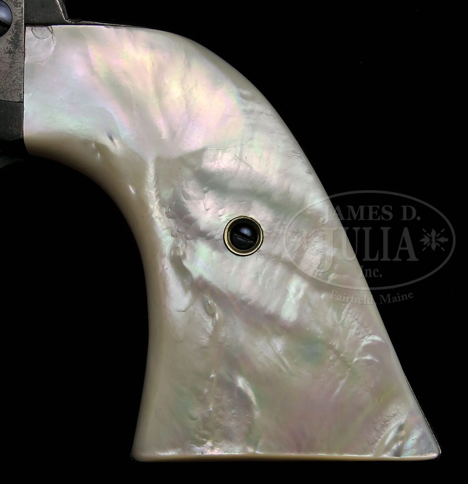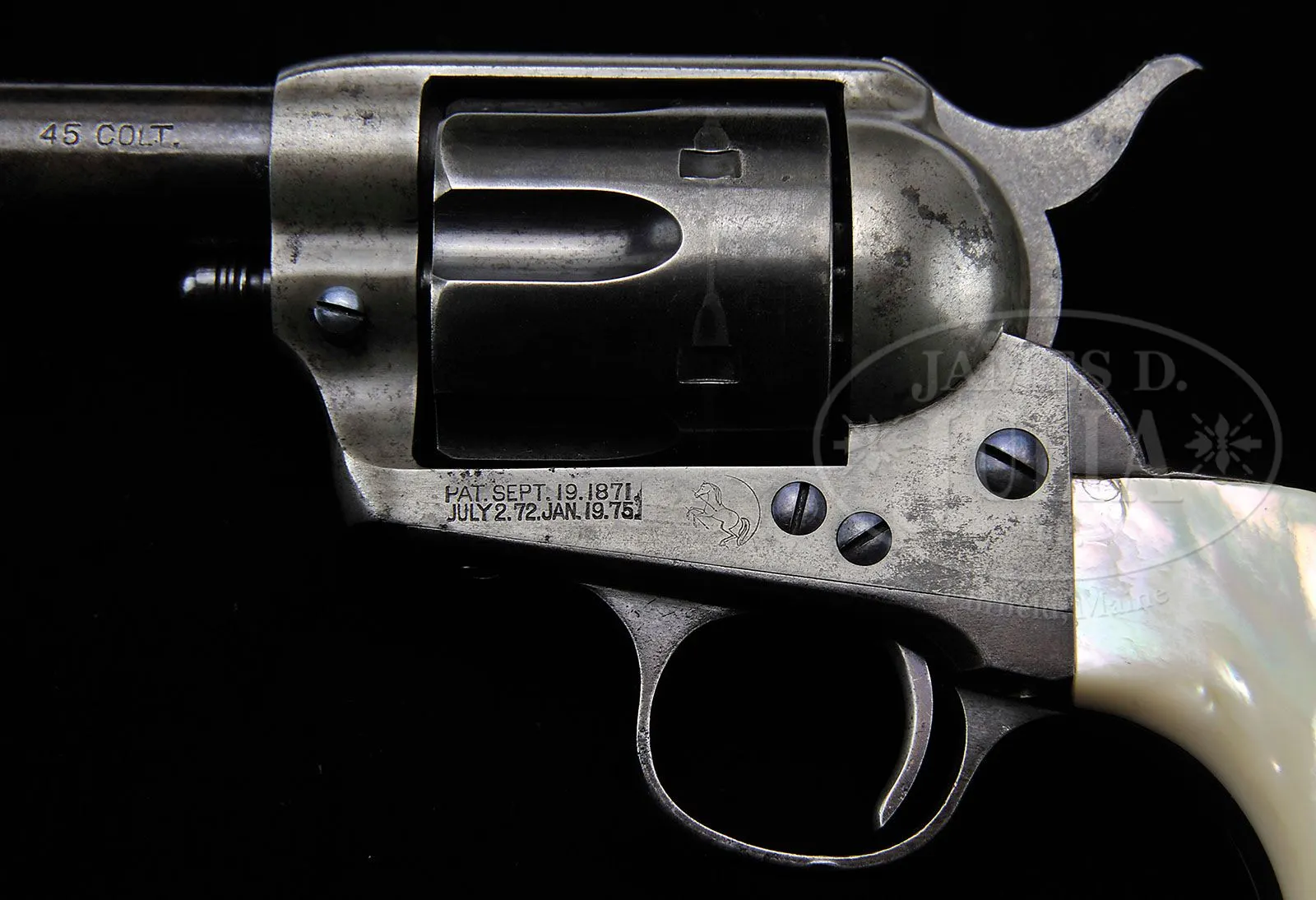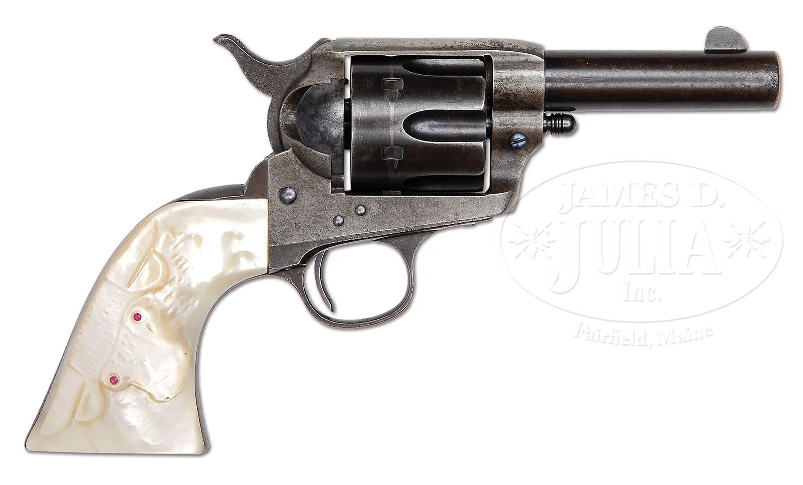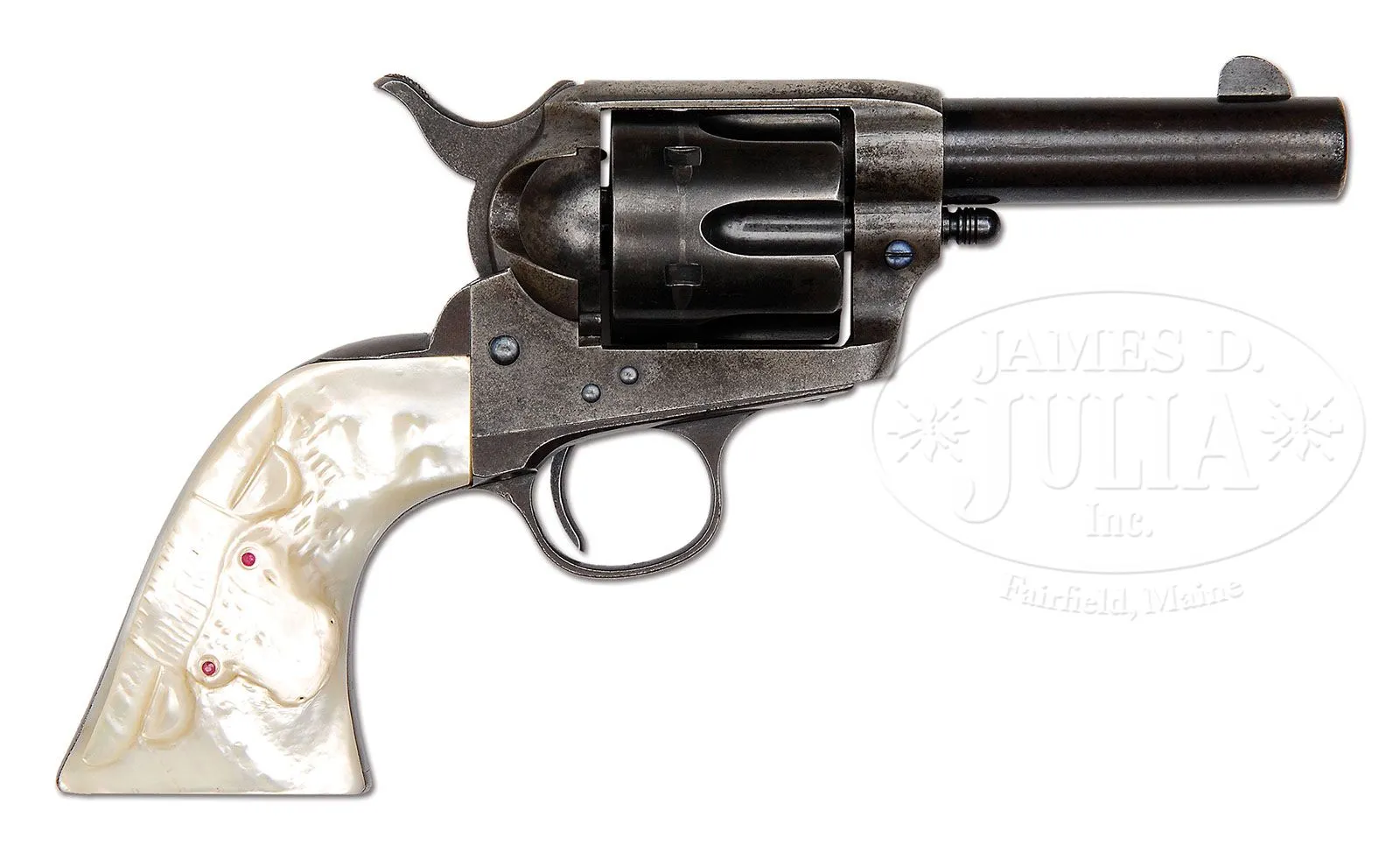 *EXTREMELY RARE COLT SHERIFF’S MODEL SINGLE ACTION ARMY REVOLVER. SN 198313. Cal. 45 Colt. Blue & color case hardened with 3-1/2″ bbl, full front sight and 2-line address with caliber marking on left side. Bottom of bbl has a tiny “45” underneath the base pin. Left side of frame has 2-line, 3-patent dates. Mounted with extraordinary 2-pc pearl grips with a deep relief carved right hand ox head with ruby eyes. Frame is orig Sheriff’s Model style made without ejector housing boss. Accompanied by a Colt factory letter which identifies this revolver, as found, type of grips not listed and shipped to Simmons Hardware Co., St. Louis, MO, c/o W.M.C. Hill on Sept. 27, 1901 in a 3-gun shipment. Also accompanied by a letter from renowned Colt authority, historian & author, Ron Graham, who states that this is one of the finest Sheriff’s Model single actions known and that among sophisticated single action collectors it is believed to be in the top range of condition for known specimens. Authentic Sheriff’s Model Single Actions are an extreme rare commodity and those with high orig condition are even more rare. CONDITION: Fine to very fine. Bbl retains about 80% orig blue, strong in sheltered areas, turning plum elsewhere with very fine pinprick pitting on each side at the muzzle; frame retains traces of case colors in the most sheltered areas being mostly faded to a silver patina; hammer also retains smoky case colors; trigger guard & back strap are a smooth even plummy/brown patina; cyl retains strong blue in the flutes with the outer diameter a plummy/blue patina. Grips are missing a couple of tiny chips, otherwise are completely sound with tremendous fire & brilliant iridescent colors. Hammer is not solid in safety notch, otherwise mechanics are fine, strong sharp bore with good shine and scattered pinprick pitting. 4-48208 JR320 (35,000-50,000)
