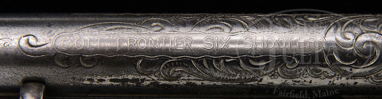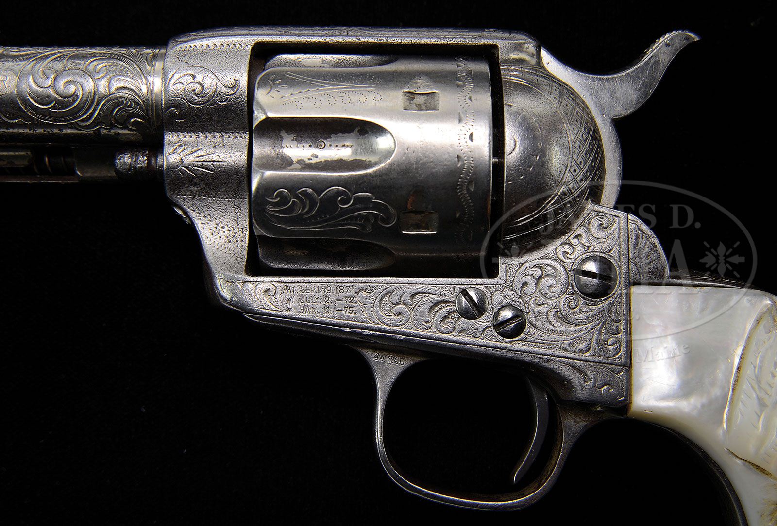 SCARCE BROWNING BROTHERS ASSOCIATED ENGRAVED FRONTIER SIX SHOOTER COLT SINGLE ACTION ARMY REVOLVER. SN 82296. Cal. 44 WCF (44-40). Nickel finish with 7-1/2″ bbl, full front sight and 1-line block letter address with “COLT FRONTIER SIX SHOOTER” etched panel on left side. Bottom of bbl is marked with a tiny “44” above the base pin. Left side of frame has 3-line patent dates and left front web of trigger guard is marked “44 CAL”. Mounted with beautiful 2-pc pearl grips with an early raised carved ox head on left side. Revolver is beautifully engraved by Cuno Helfricht with fine foliate arabesque patterns on the frame that has very fine pearled or punch-dot background. Left recoil shield is engraved with a large flower blossom and diamond & dot patterns with a matching flower blossom on loading gate. Top strap is engraved in leaf & vine and geometric patterns with sunbursts & foliate arabesque patterns on both sides of the front frame. Engraving extends up both sides of the bbl and each side of the muzzle with snake & dot patterns around the address and on each side of the bbl between the engraving patterns. Ejector housing is third type with half moon ejector rod head and has snake & dot patterns in top gullet & on outer radius. Bottom edge of the outer radius is hand-filed with seven small notches. Cyl is engraved in alternating foliate arabesque & geometric patterns on the lands between the flutes with light decorations in the flutes and a snake & chip pattern around the rear edge. Back strap & butt strap are engraved in geometric patterns with a beautiful fan pattern at the top of the back strap and a small sunburst on the trigger bow. Base pin is orig type with dimpled ends. Accompanied by a Colt factory letter which lists two single action revolvers with the same SN, one of which is this revolver in caliber 44-40, with 7-1/2″ bbl, nickel finish, pearl stocks and factory engraved, shipped to Browning Bros., Ogden, Utah on May 18, 1887 in a 1-gun shipment. Given the time frame and the destination of the shipment of this Colt leaves no doubt that it saw service, probably with a lawman or wealthy rancher, on the western frontier. CONDITION: Very good. Bbl retains 40-50% orig nickel with the balance cleaned to bright metal; etched panel is completely legible; frame retains traces of orig nickel, having been cleaned to a gray metal patina and shows heavy wear on the recoil shield & loading gate; cyl is a matching patina showing moderate to heavy wear; trigger guard & front strap retain about 40-50% orig nickel with the balance gray metal patina; back strap & butt strap retain 92-93% strong orig nickel. Left grip has a repaired toe and chipped heel, otherwise is sound and retains great fire & color; right grip is possibly a more recent replacement showing very little wear with great fire & color. Mechanics are fine, strong bright bore with a slight ring about 1-1/2″ from muzzle. 4-48277 JR376 (13,000-18,000)