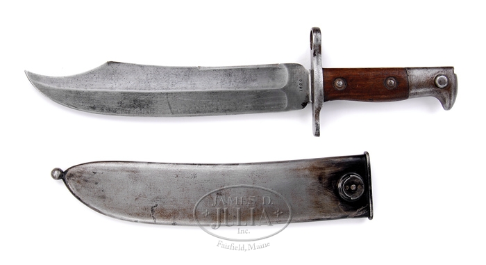 RARE KRAG BOWIE BAYONET. Usual configuration with 9″ clip point diamond shaped blade marked “1900” on left ricasso and “US” on right ricasso. It has standard hand guard with muzzle ring and wood grip panels with eagle head pommel. Accompanied by an orig steel scabbard with ball tip and stud on back side for the metal Krag-type belt hanger, which is missing. CONDITION: Fine. Blade retains a lightly cleaned gray patina with evidence of light sharpening and slightly rounded tip with some very fine surface pitting. Handle is fine. Sheath is a cleaned gray metal color with traces of orig finish in very sheltered areas. 8-87526 JR429 (1,350-1,750)