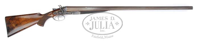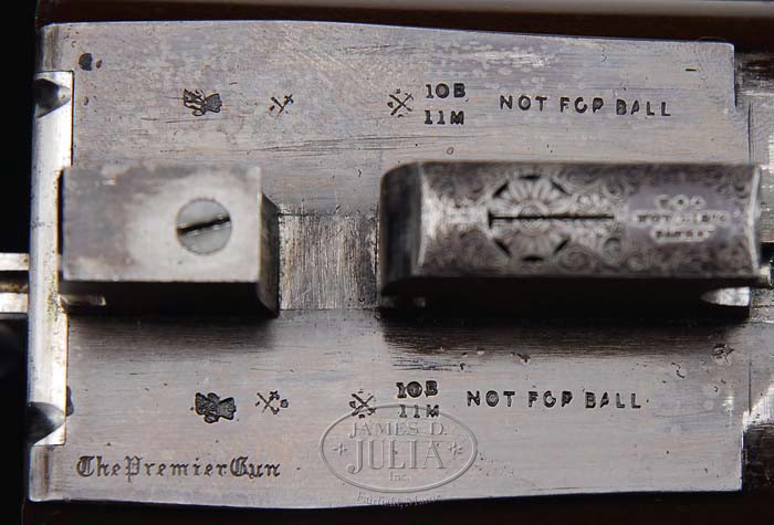 SPECTACULAR W & C SCOTT & SON PREMIER QUALITY TOP LEVER HAMMER GUN WITH ORIGINAL CASE AND ACCESSORIES. SN 10666. Cal. 10ga. 2-7/8″ Chambers. Dbl trigger. 32″ Dove-tailed Damascus bbls are marked “Scott’s Patent Triplex. W & C Scott & Son. (THE PREMIER QUALITY) 10. GT. Castle Street. Regent. Circus. London” and have a triangle of scroll engraving on the extension of the smooth concave rib. Bbl flats have provisional and definitive black powder Birmingham proofs and are marked “10 B” “11 M” and “Not for Ball” and the left flat is marked “The Premier Gun.” Bottoms of the bbl are stamped w/ SN “10666”(1878). The front lump is fitted w/ Scott’s patented action tightening screw and is marked “USA Nov. 1-1870 Patent” The water table is marked “W.CS. S Patent Oct 65” “2752” in a rectangle, as well as, “W & C Scott & Son Makers”,”Patent Action” ,”The Premier Gun”, Scott castle logo, SN, and proofs. The action and lock plates have 85% coverage of beautifully executed scroll engraving. The serpentine hammers are nicely filed and scrolled engraved as well. Top lever is marked “W & C Scott & Son Patent”. Trigger guard has scroll, and is engraved “No.10666”. The well figured and streaked Circassian walnut full pistol grip buttstock measures 14-1/4″ over a checkered horn butt plate and features drop points, horn grip cap, and a gold shield behind the top tang, as well as, 20 LPI borderless checkering. The splinter forend is fitted w/ Scott’s patent take down lever and is checkered to match the buttstock. Bore diameter: left -.777, right -.777. Bore restrictions: left -.027, right -.026. Wall thickness: left -.029, right -.033. Drop at heel:2-7/8″, drop at comb:1-7/8″ . Weight:10 lbs 9oz. The original leather case has a green cloth interior, and original W & C Scott label marked w/ number “10666.” Case contains a leather wallet w/ 2 top lever springs, a 3-pc ebony cleaning rod w/ German silver furrels, cleaning brushes, and reloading tools to include rosewood capper and decapper by BGI, wad rammer by BGI, and roll crimping tool by James Dixon, and stuck case remover by J.L.Rawbone. There’s also a glass oil bottle w/ pewter top and a reproduction W & C Scott paper label. PROVENANCE: Notes from consignor detailing history of the gun. CONDITION: Extremely fine. BBls retain 97-98% orig Damascus finish w/ a few rub marks at muzzle, and breech, finish thinning in an area 9″ from the breech from handling. Bores are bright and shiny w/ minor pitting just in front of chamber in the right barrel. Action retains 95% orig brilliant case color, silvered on the action beads, and thinning on the outer area of the fences. Lock plates and hammers retain 98%+ of their brilliant case color. Trigger guard retains 40% orig case color mostly faded to silver. Top lever retains 97% orig blue. Screw slots are excellent. Top lever screws show use. Wood retains 98% of orig oil finish w/ very few minor handling marks. Without doubt as fine an example of a gun from this era that you will find. Consignor states that this gun took a gold medal in the “Concours d’Elegance” in Millbrook, NY in 2003. Case: Leather is dry, cracked and rubbed, w/ pieces missing on the front and rear edge. Interior partitions are good and tight. Accessories are excellent. 4-35486 MGM17 (11,000-15,000)