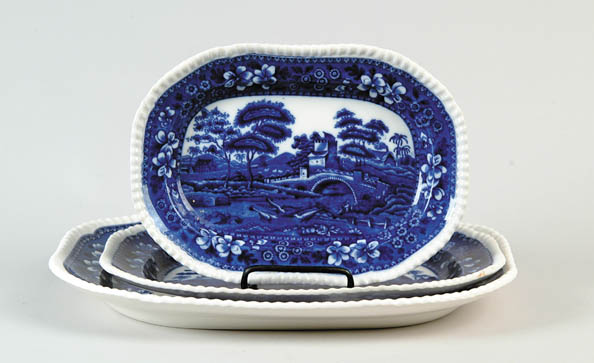 COPELAND SPODE TOWER: GRADUATED SET OF THREE PLATTERS. Blue oval mark “Copeland Spode’s Tower England” to base, also impressed mark to base. SIZES: 14-3/4” x 11-3/4”; 12-3/4” x 9-3/4”; 10-1/2” x 7-1/2”. CONDITION: Very good, no cracks no chips. 9-94388-531 (300-500)