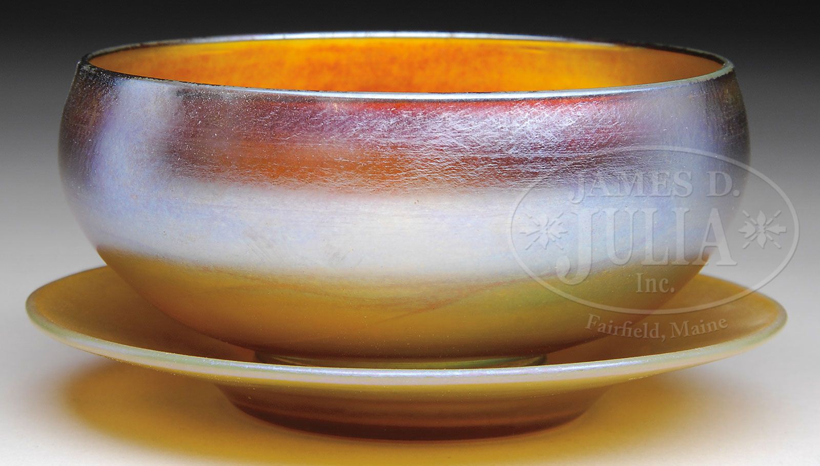 TIFFANY STUDIOS FAVRILE BOWL & UNDER PLATE. Simple gold favrile glass bowl and under plate have an Arts & Crafts influence. Each piece has a vibrant iridescent finish. Bowl is signed “L.C.T. Favrile”. Plate is signed “L.C.T.”. SIZE: 2-1/4″ x 5″. CONDITION: Very good to excellent. 5-64247 (300-500)