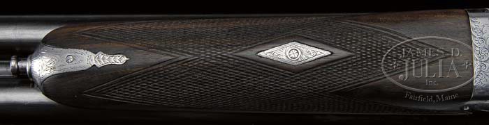 *W. J. JEFFERY & CO. BOXLOCK EJECTOR 2″ LIGHT GAME GUN. SN 39660. (ca 1950) Cal. 12 ga. 2″ Chambers. 26″ Dovetailed steel bbls are engraved with “W. J. Jeffery” and Golden Square address on tops. Narrow “Churchill” rib is inlaid in gold “For 2 inch case only”. Bottom of bbl flats are stamped with Birmingham nitro proofs for 2″ chambers and 1-1/8 oz of shot. Scallop-backed boxlock action features automatic safety and double triggers. Action is engraved with 60% coverage English scroll, with “W. J. Jeffery & Co. Ltd.” in ribands on each side. Scroll engraved trigger guard has SN at grip. Nicely marbled European walnut straight grip buttstock measures 14-7/8″ over Silvers-type buttplate and 7/8″ wood extension (13″ over original wood). Splinter ejector forend has Anson release. Bore diameter: left -.734, right -.734. Bore restrictions: left -.006, right -.002. Wall thickness: left -.024, right -.019. Drop at heel: 2-9/16″, drop at comb: 1-9/16″. Weight: 5 lbs. 8 oz. LOP 14-7/8″. CONDITION: Fine, as refinished. Bbls retain 60% of older re-blue, silvered at muzzles, and thinning overall. Action retains 60 – 70% of an older case hardened re-color, engraving slightly washed. Stocks retain most of an old oil re-finish over numerous marks and minor dents. Checkering has been re-cut. Bores are very fine, with light frosting. Action is tight. Bbls are on face. Ejectors are in time. This lightweight fast handling gun was obviously someones long time favorite, as it shows many years of use and continued maintenance. Two inch guns by all makers are relatively scarce and sought after. 4-42309 MGM33 (2,000-3,000)