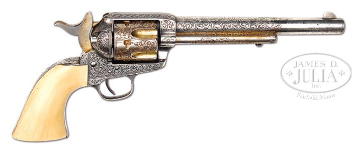 FINE AND IMPORTANT CUNO A. HELFRICHT ENGRAVED COLT SINGLE ACTION REVOLVER, SILVER- AND GOLD-PLATED WITH ONE-PIECE IVORY GRIPS , WITH EXHIBITION GRADE EMBELLISHMENTS. SN 56286. .45 cal, 7-1/2″ bbl with one-line maker and Hartford address marking on top; “45 CAL” on left side of front bow of triggerguard; three-line three patent date marking on left side of frame; silver-plated with gold-plated cyl, hammer and ejector rod housing; blued screws, cyl pin, ejector rod head and trigger; one-piece ivory grips. Profusely and finely scroll and border engraved on barrel, ejector rod housing, cyl, frame and gripstraps; ejector rod housing also with zig-zag lines and punched dot motifs; sunburst motif on top flat of backstrap. Note last four digits of serial number, 6286, on cyl within riband, in line with one of the flutes. Included is a Colt factory letter stating revolver left factory with silver finish and gold-finished cyl, ejector and hammer. Ivory grips. It was shipped on July 5, 1880 in a shipment of one gun to C.E. Gildea. CONDITION: Fine. 85% silver-plating, with tarnish, blemish near muzzle; light wear and spots patina; 75% gold,light wear and patina;50% blue; engraving sharp; grips very good to fine, rich, mellow patina; minor chipping and wear at butt and cracks visible on butt of grips. See R.L. Wilson, The Colt Engraving Book, volume I, chapter 10, page 416, where this revolver is pictured in color, with detailed description, identifying the work as by Cuno A. Helfricht himself. Wilson’s The Colt Engraving Book, volume I, page 416, notes: “Considered one of the finest prewar Single Action Army revolvers known.” 4-46567 JDJ52 (75,000-85,000)