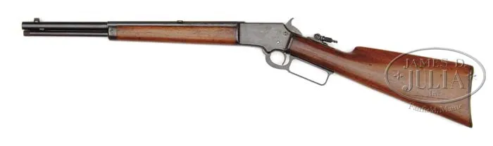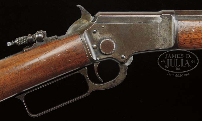RARE MARLIN 1897 SPECIAL STYLE BICYCLE RIFLE W/HALF ROUND BBL. SN 160352. Cal .22 S,L,LR. Bbl is 16″ part rnd. Full magazine with capacity of 16 short, 12 long, 10 long rifle cartridges. Top bbl flat marked “MARLIN FIRE-ARMS CO. NEW-HAVEN CT., U.S.A./PAT’D JAN. 18,1897. APRIL 2,1889. AUG.12,1890. MAR.1,1892.” Top of receiver is marked “MARLIN SAFETY” Ivory bead front sight. Filler in the rear sight dovetail. Lyman combination tang rear sight. Stock with straight grain quarter sewn American walnut. Marlin curved checkered hard rubber buttplate. Brophy’s book on Marlins states that only 5 half-round 1897 Bicycle Rifles were made. PROVENANCE: George F. Peters Collection CONDITION: Good. Bbl blue mixing with patina with fine spotting on the rnd portion and areas of light pitting on the oct portion. Magazine has good blue with small areas of fine spotting. Magazine cap has patina mixing with spots of fine spotting. Receiver has traces of case colors in the protected areas mixing with patina and fine spots and pitting. Lever has patina with scattered light pitting. Buttstock has a repaired chip on the left side along the top tang. Fine crack extending from the top tang along the left side of the comb and a fine crack extending from the lower tang. Stock and forend have naturally worn orig finish with light crazing and numerous light to moderate handling marks. Sound mechanics. Bright bore with a small amount of very light pitting. 4-41773 DS10 (3,000-4,000)