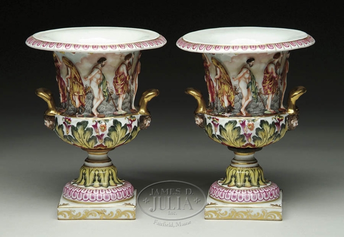 PAIR OF CAPO DI MONTE URNS. Wide flaring two handled urn sits atop a square base. Body decorated with semi-nude classical figures. Double mask head handles are trimmed in gold with blue mark to base. SIZE: 8” h x 6” w. CONDITION: Very good. 9-28733 (500-800)